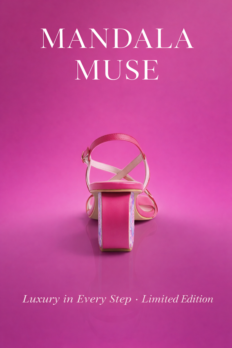 Designed in vibrant pink tones with refined strap detailing, this limited-edition piece features a signature sculpted heel adorned with a mandala motif—symbolizing creativity, unity, and inner grace. The bold yet balanced design transforms every step into a work of art.