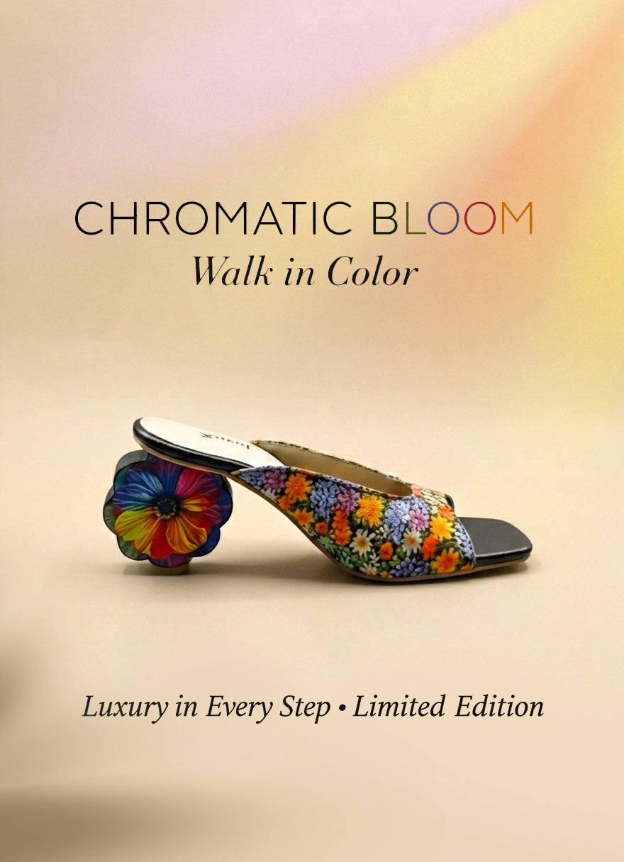 Designed for women who embrace color with confidence, this limited-edition piece features a vibrant floral upper paired with a sculptural multicolor bloom heel—turning every step into a statement. The harmonious blend of hues captures the joy of celebration while maintaining an elevated, luxurious feel.