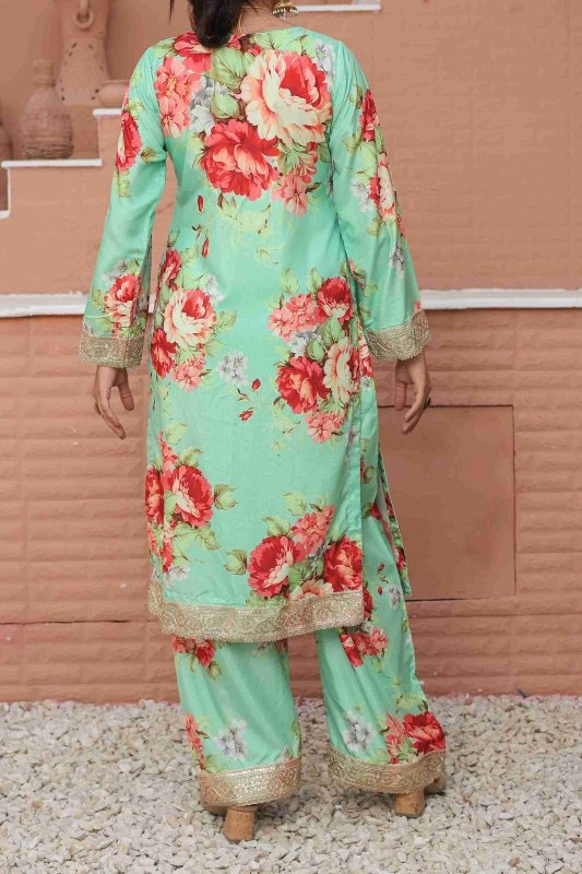 Step into elegance with the Mint Blossom Luxe suit, crafted from premium Russian Silk for a luxurious drape and buttery-soft comfort. Designed in refreshing mint tones, the outfit blooms with vibrant red and peach floral patterns, making it a statement piece for festive and semi-formal gatherings.