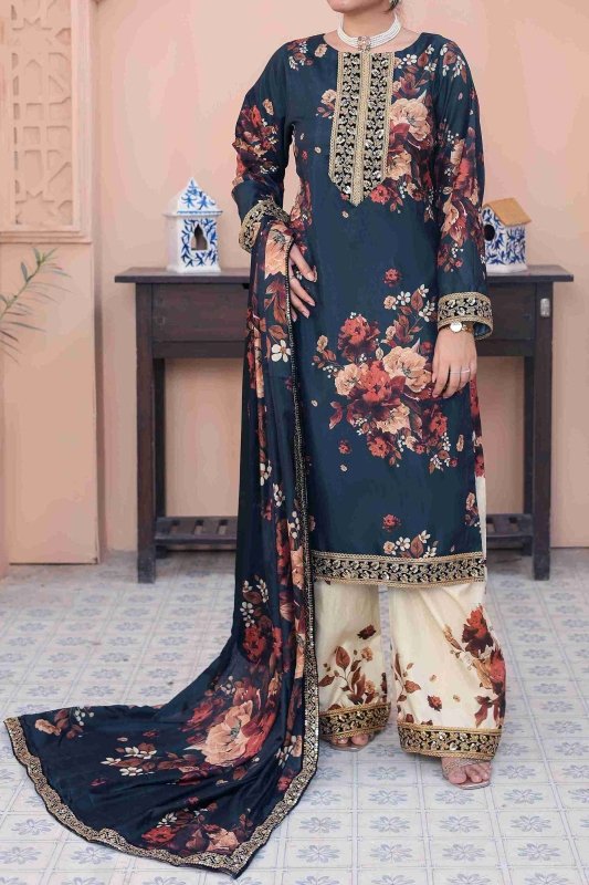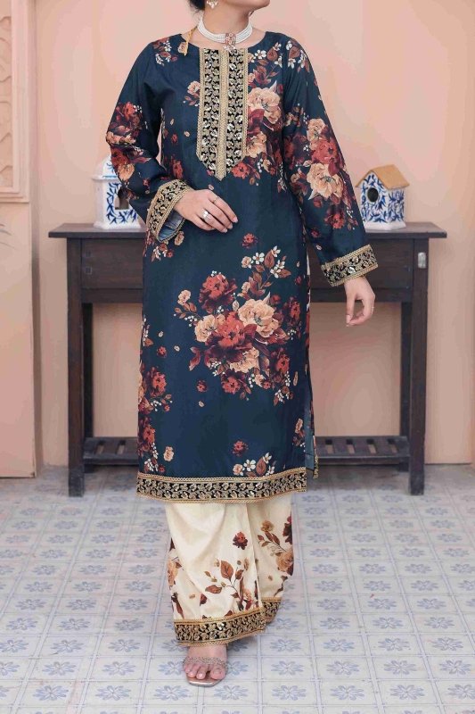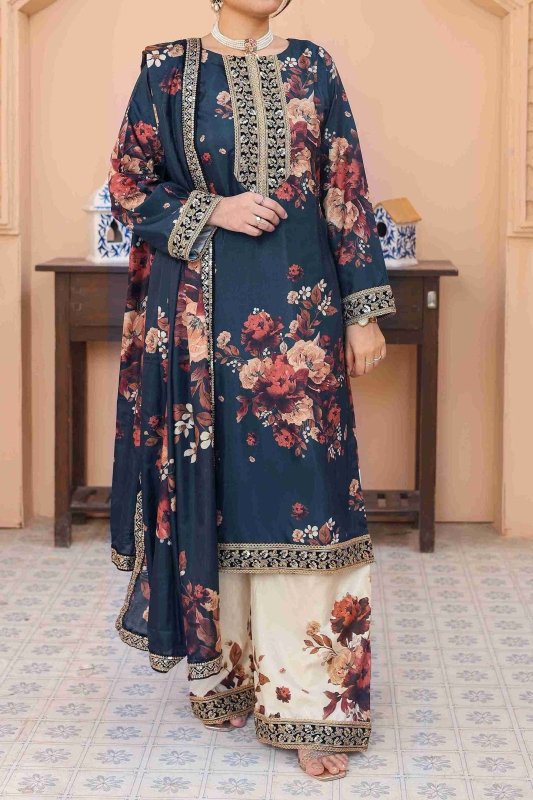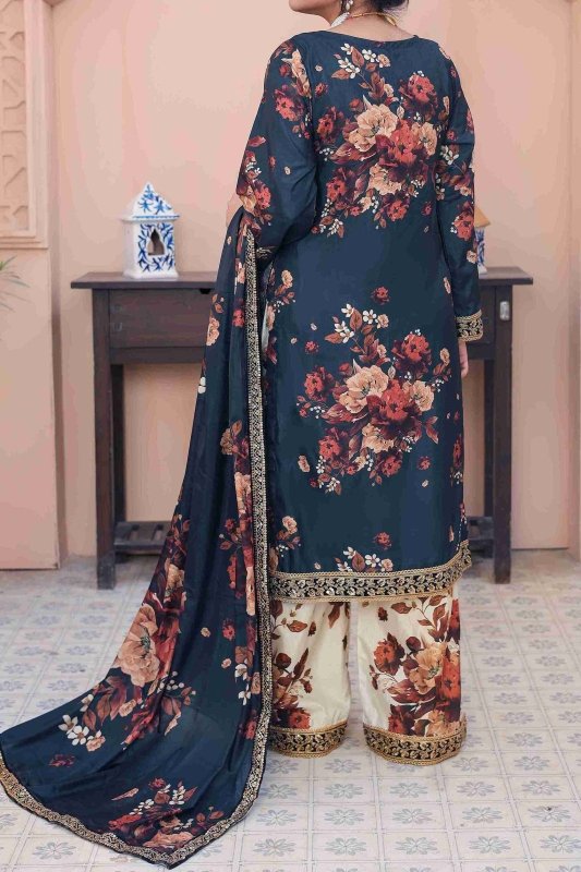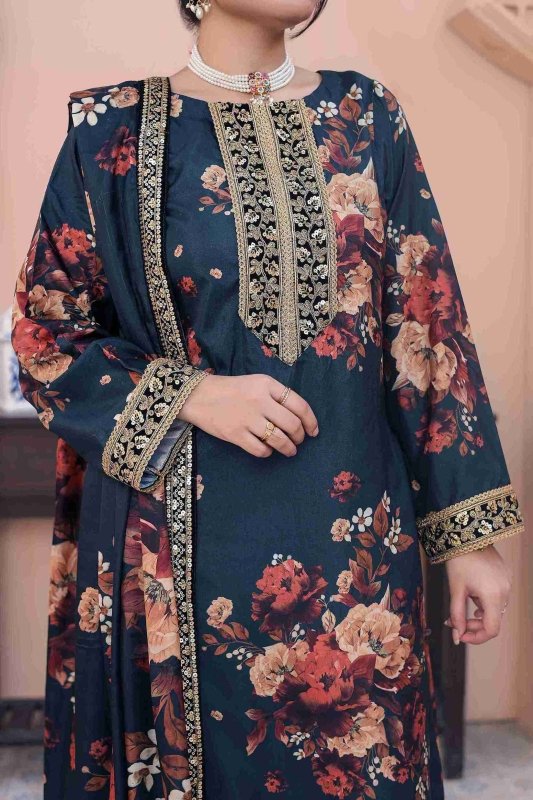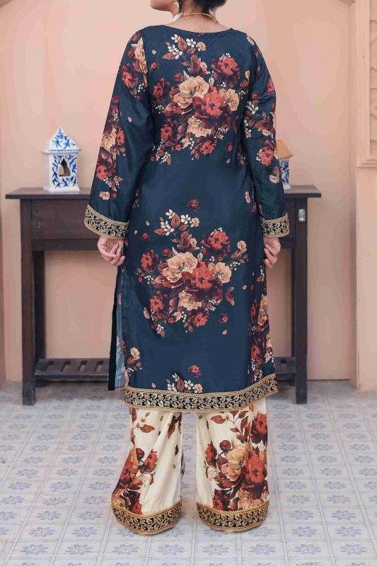 Celebrate timeless elegance with Autumn Noir, a graceful 3-piece suit crafted with premium fabrics. The shirt, made from luxurious Russian Silk, features a rich black base with warm autumn-toned floral prints in burnt orange, beige, and ivory. Detailed embroidery at the neckline and golden lace finishing on the sleeves and hem bring a refined charm to the design.