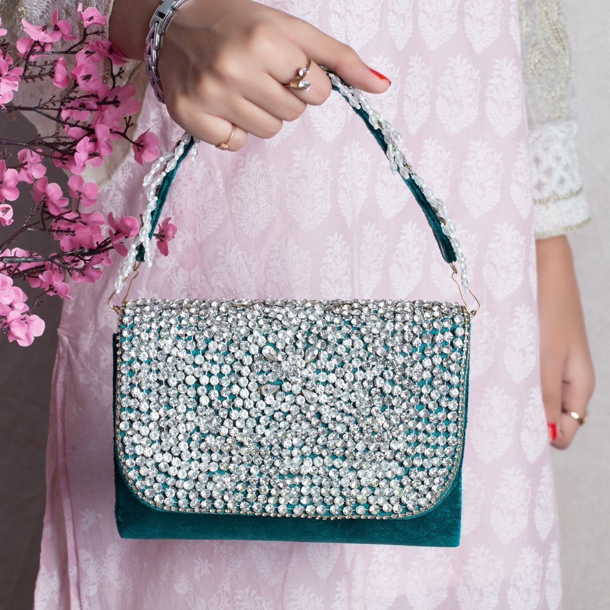 Embellishments: Beads, Pearl Drops, Pearls, Flower-shaped sequins, Glass beads.