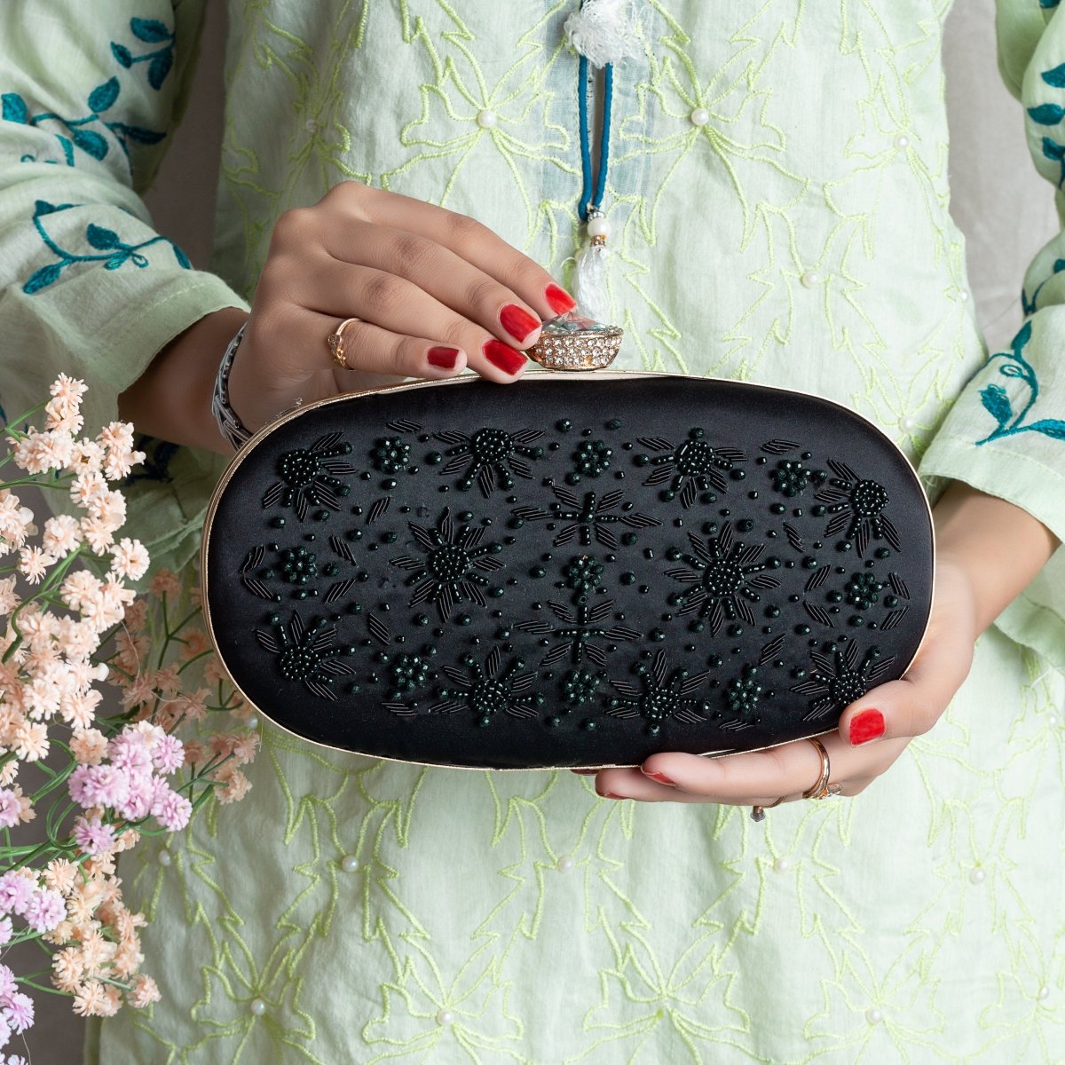 A new classic for your most special occasions. Our sleek, rectangular shaped clutch combining with dazzles in rich materials for a fresh take on party occasions. Golden toned metal hardware and handmade embedded wristlet makes it way more appealing yet trendy.