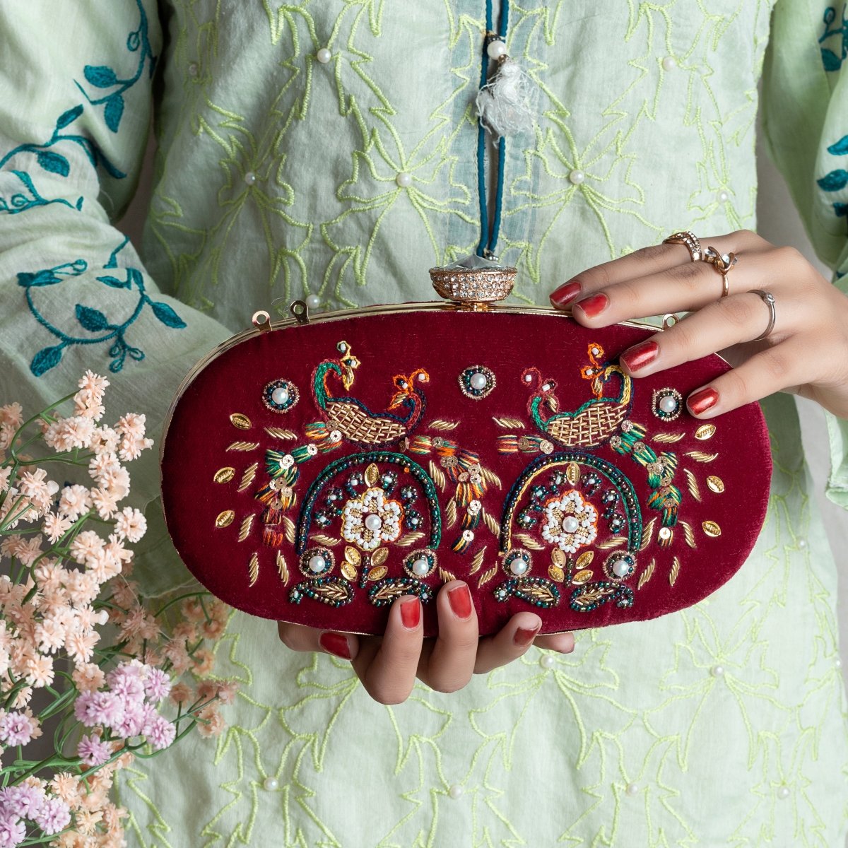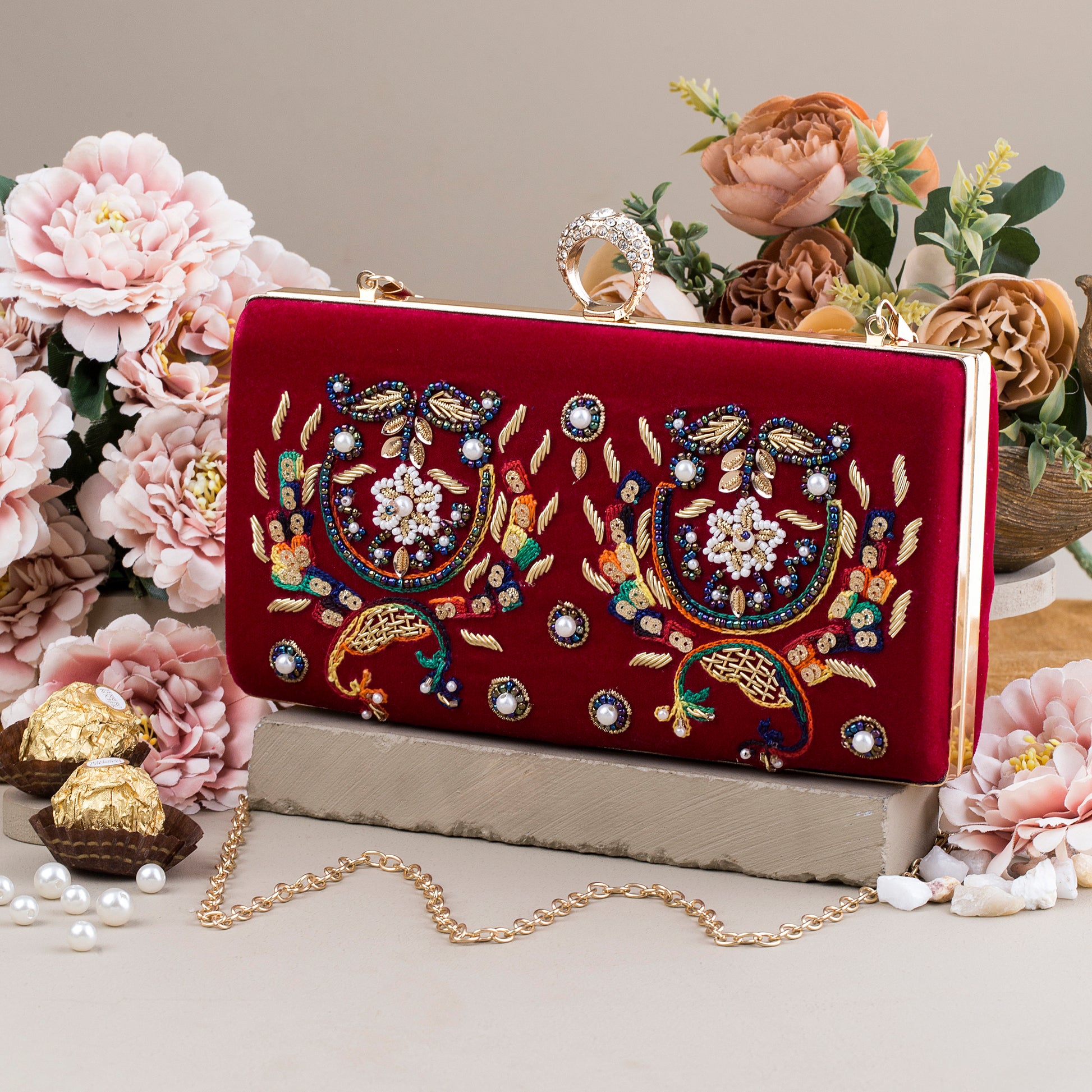 A new classic for your most special occasions. Our sleek, rectangular shaped clutch combining with dazzles in rich RED material for a fresh take on party occasions. Golden toned metal hardware and handmade embedded wristlet makes it way more appealing yet trendy.