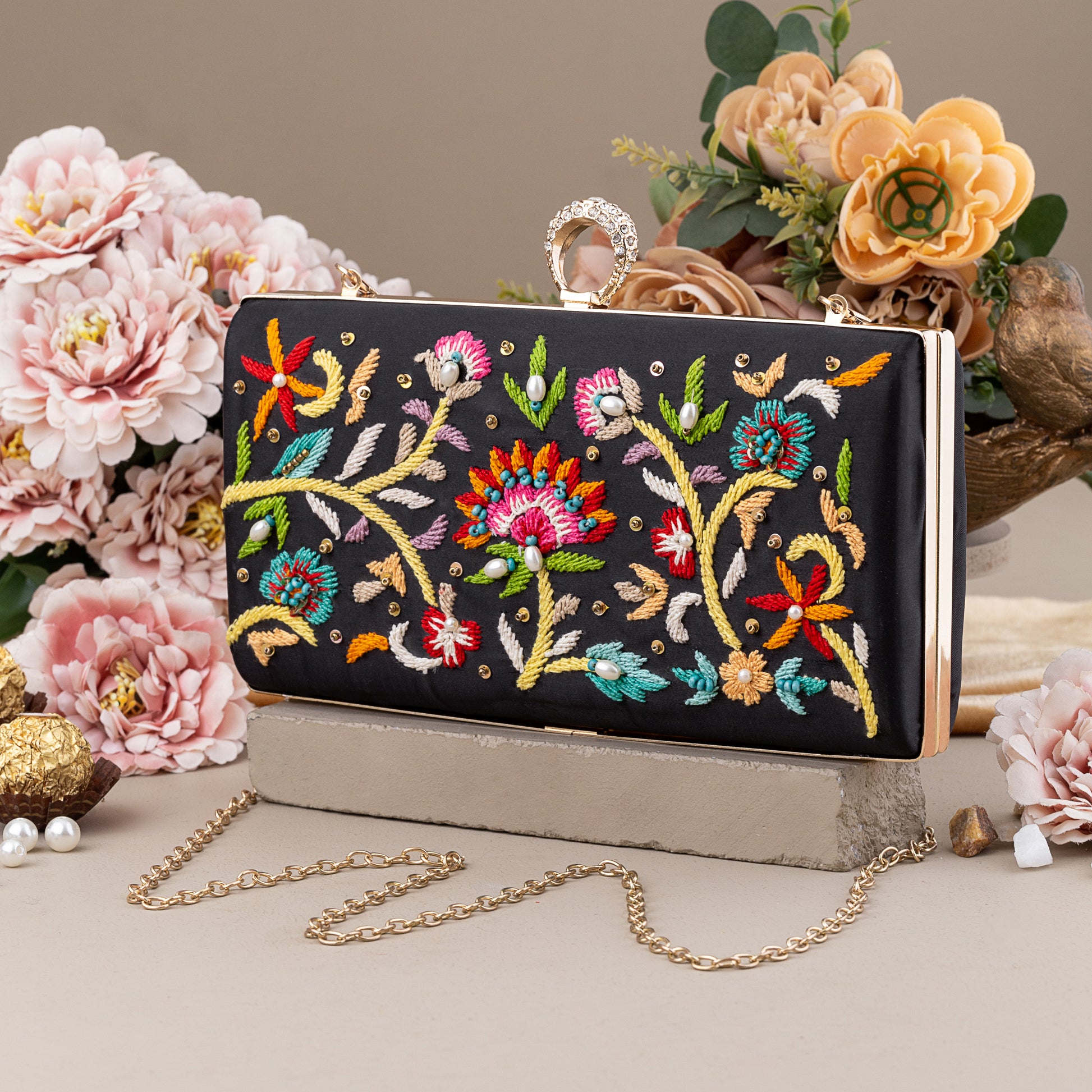 A new classic for your most special occasions. Our sleek, rectangular shaped clutch combining with dazzles in rich BLACK material for a fresh take on party occasions. Golden toned metal hardware and handmade embedded wristlet makes it way more appealing yet trendy.