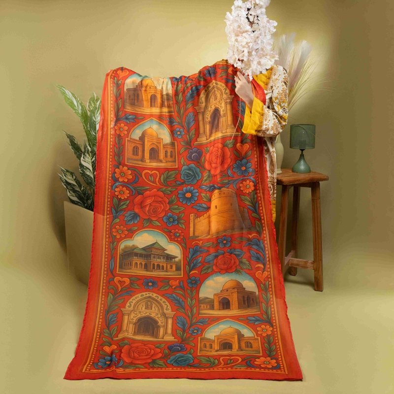 Wrap yourself in the heritage of Pakistan with the Cultural Legacy Dupatta — a beautifully curated tapestry of history, architecture, and traditional art. Adorned with majestic depictions of Pakistan’s iconic landmarks such as forts, shrines, and palaces, this dupatta is a tribute to the nation's rich past. Each monument is framed in lush floral truck art motifs, brought to life on a fiery rust-orange canvas with vibrant roses and vines in bold hues of red, blue, and green.