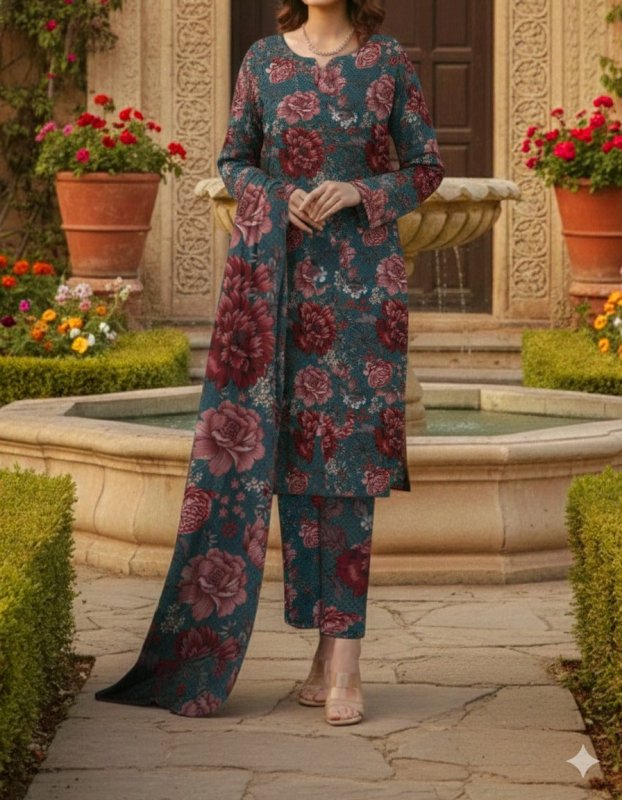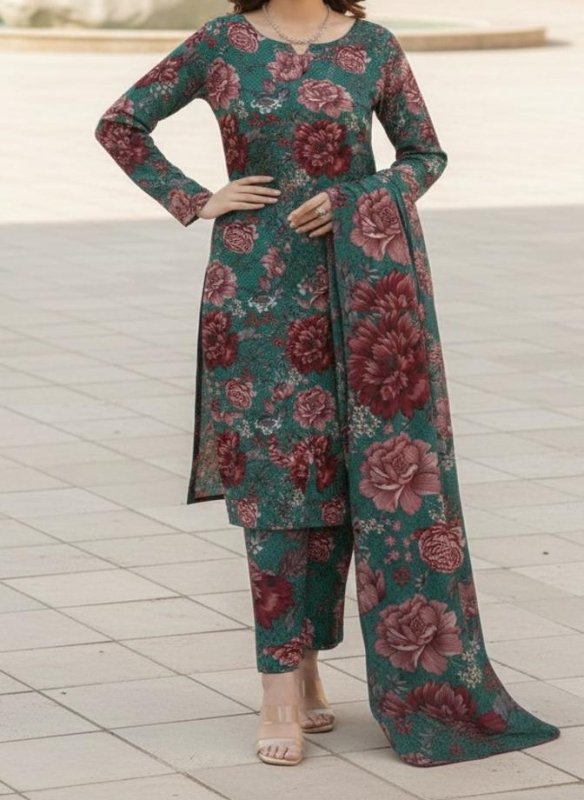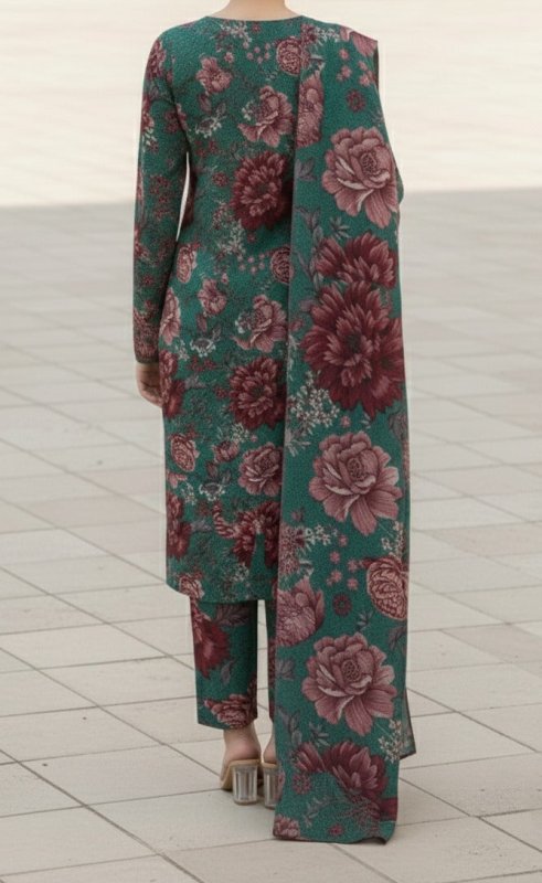 The deep emerald green base is adorned with bold floral prints in burgundy and rose tones, creating a luxurious and eye-catching winter look. Featuring a straight-cut silhouette with a matching printed dupatta and trouser, this outfit offers both style and ease for everyday winter wear or semi-formal occasions.