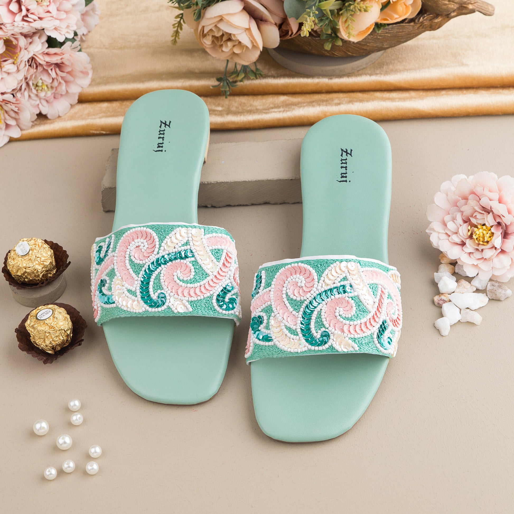 FL-42-SKY GREEN is a quintessential exemplary of pleasant, luxurious and traditional artistry FLATS made with beautiful hand made work . These are the adorable heritages of Pakistan that are hand-sewed by determined cordwainers of rural areas to exhibit the utmost beauty of prepossessing feet.
