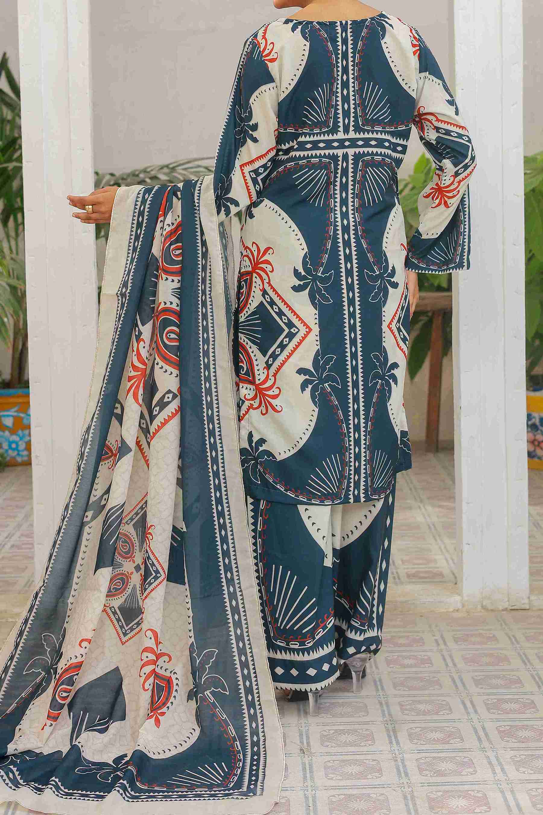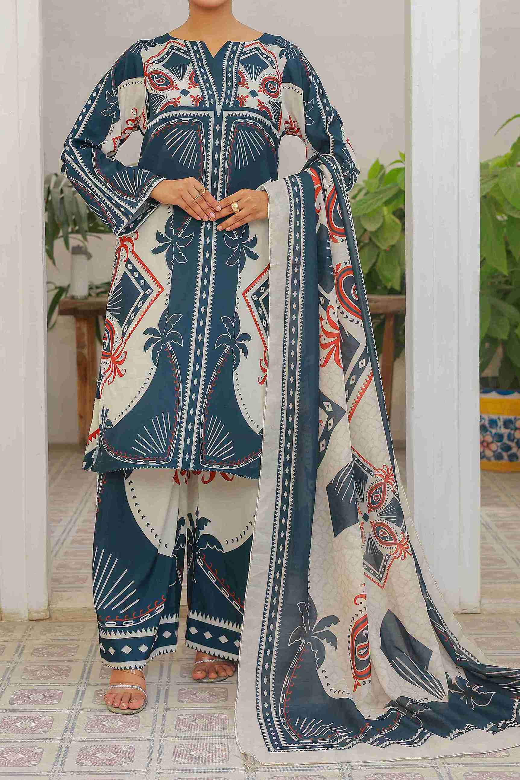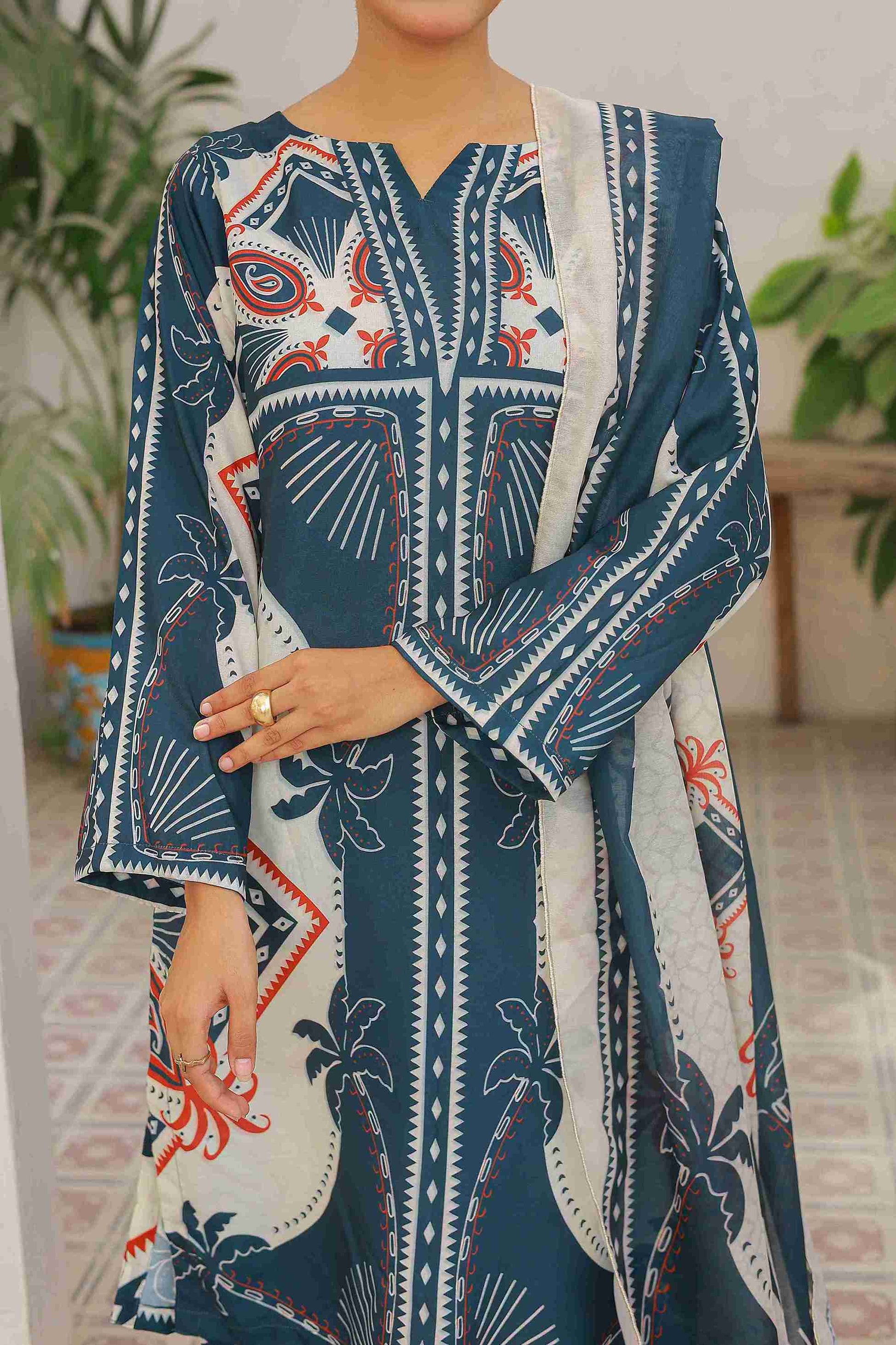 Trouser: Swiss Lawn – wide-leg design with matching geometric and palm motifs for a harmonious finish.