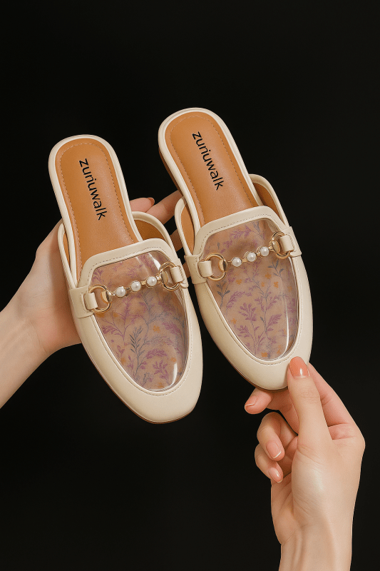 Step into elegance with the Transparent Mules by ZurujWalk – a perfect fusion of style and sophistication. These cream-toned mules feature a transparent upper embedded with a delicate floral print in soft pinks, oranges, and warm earthy tones, enhanced with a golden chain and pearl detailing. The flat sole ensures all-day comfort, while the airy design adds a refreshing twist to your everyday or semi-formal outfits. Ideal for brunch dates, office wear, or casual outings, these mules redefine summer chic.