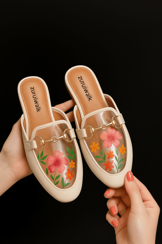 Step into elegance with ZurujWalk’s Pearl Garden Loafers, where delicate floral charm meets chic sophistication. Featuring a transparent upper embedded with a vibrant hand-painted floral design, these slip-ons are adorned with a graceful gold-toned buckle and a strand of pearls for a regal finish. The soft beige base and cushioned insole ensure all-day comfort, making them perfect for casual brunches, festive gatherings, or everyday glam.