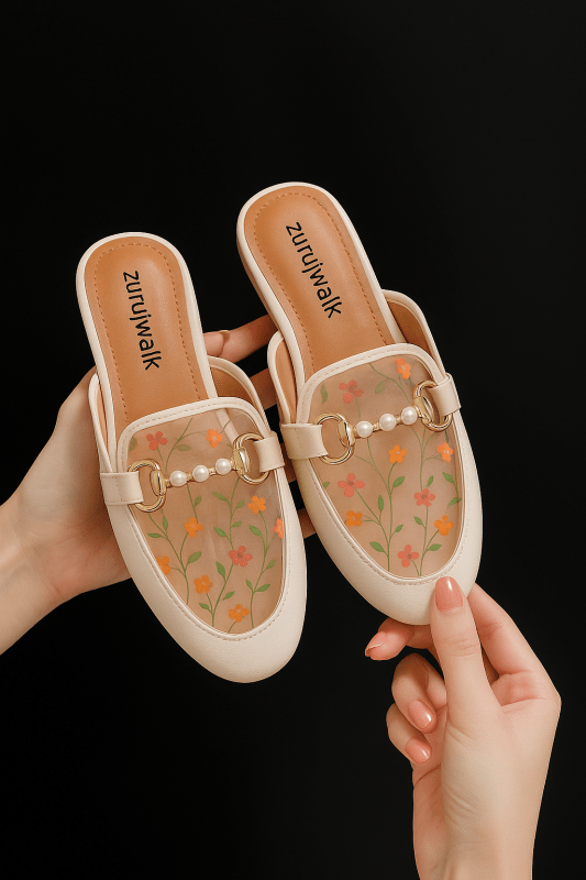 Step into elegance with the Transparent Mules by ZurujWalk – a perfect fusion of style and sophistication. These cream-toned mules feature a transparent upper embedded with a delicate floral print in soft pinks, oranges, and warm earthy tones, enhanced with a golden chain and pearl detailing. The flat sole ensures all-day comfort, while the airy design adds a refreshing twist to your everyday or semi-formal outfits. Ideal for brunch dates, office wear, or casual outings, these mules redefine summer chic.