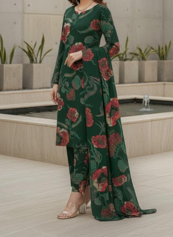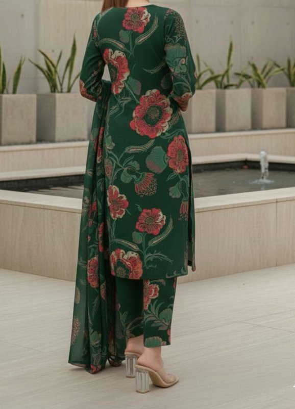 The deep forest green base is beautifully enhanced with bold floral prints in warm red and muted earthy tones, creating a luxurious yet balanced winter look. Designed in a straight, flattering silhouette with a matching printed dupatta and trouser, this outfit ensures comfort, elegance, and effortless style.