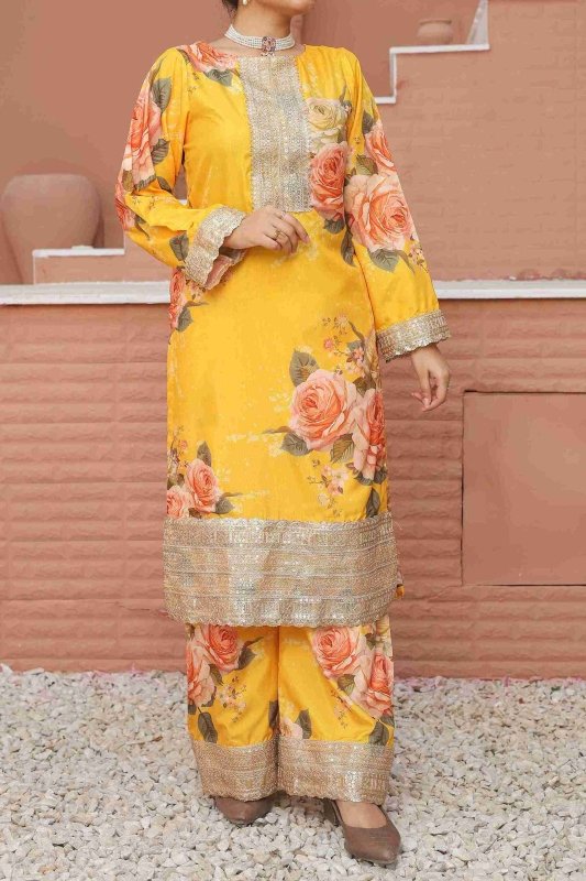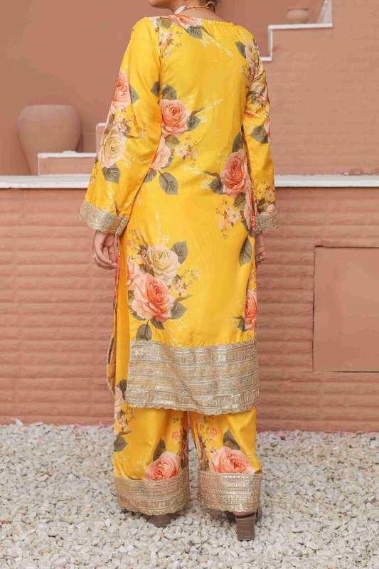 Radiate sunshine and elegance in Golden Bloom, a stunning 3-piece suit tailored from luxurious Russian Silk. The vibrant yellow base bursts with pastel-hued roses, blending freshness with timeless grace. The shirt is detailed with a beautifully embroidered neckline and golden lace on sleeves and hem for a regal finish.
