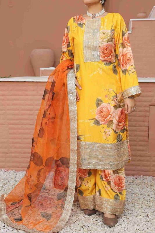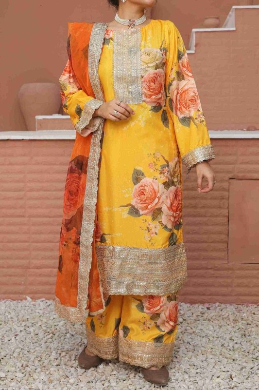 The wide-leg trousers carry matching floral motifs, while the flowy orange dupatta with rose patterns and golden lace borders adds depth and sophistication, making this outfit the perfect choice for festive and celebratory occasions.