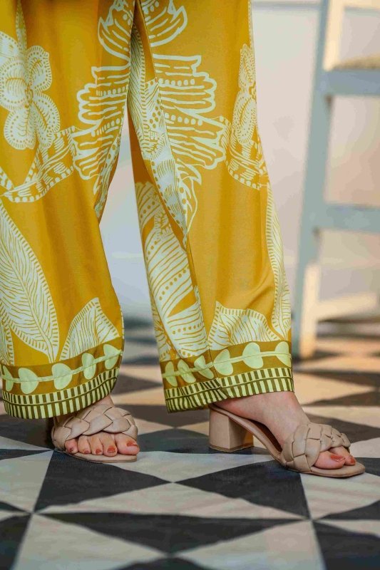 The Golden Bloom Co-Ord Set features a vibrant mustard hue adorned with intricate botanical and geometric prints in shades of gold and green. The striking patterns on the shirt’s panel and cuffs, complemented by the detailed trousers, offer a refined yet contemporary look.