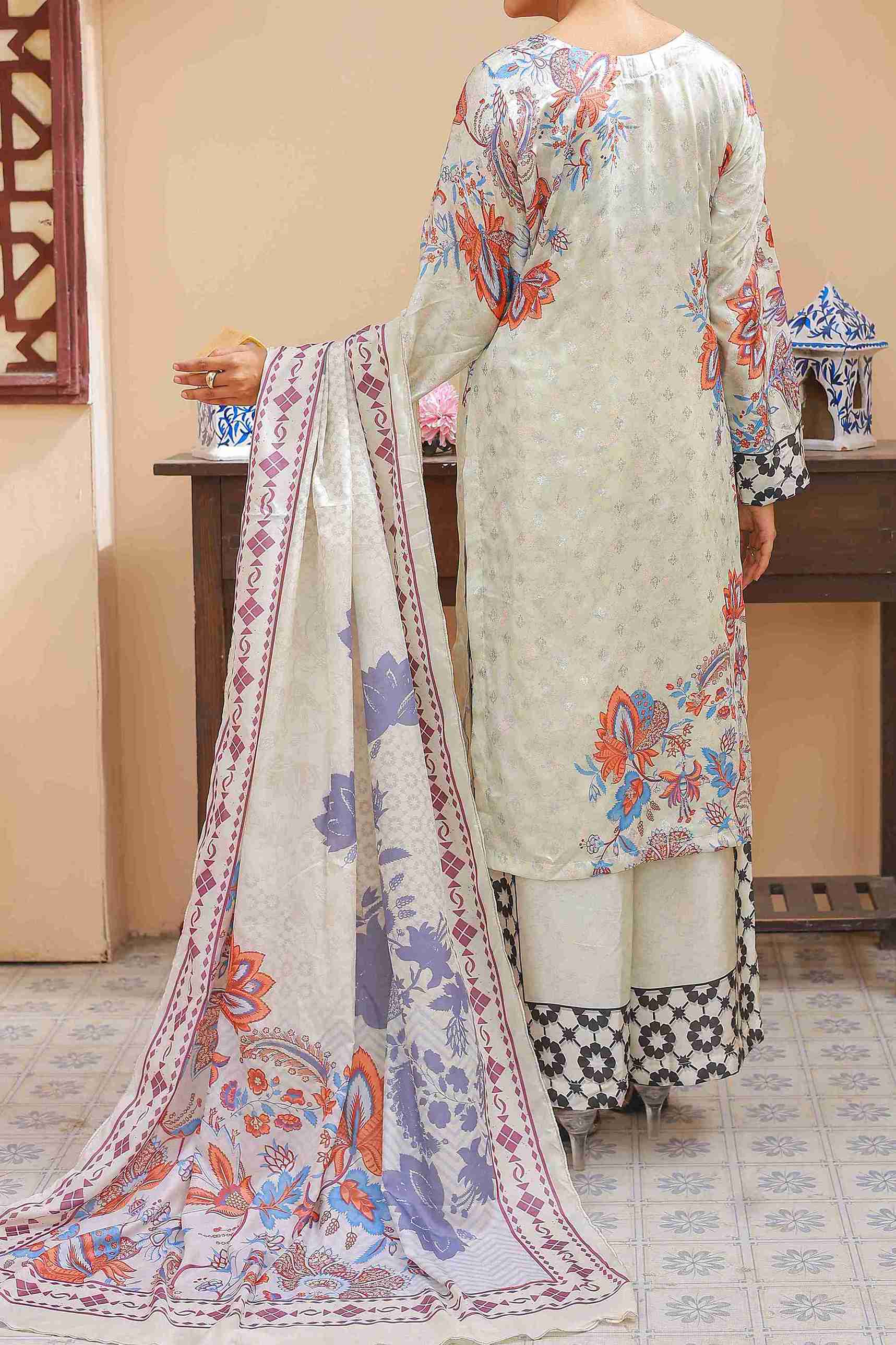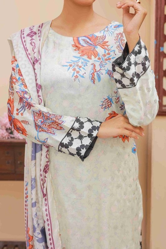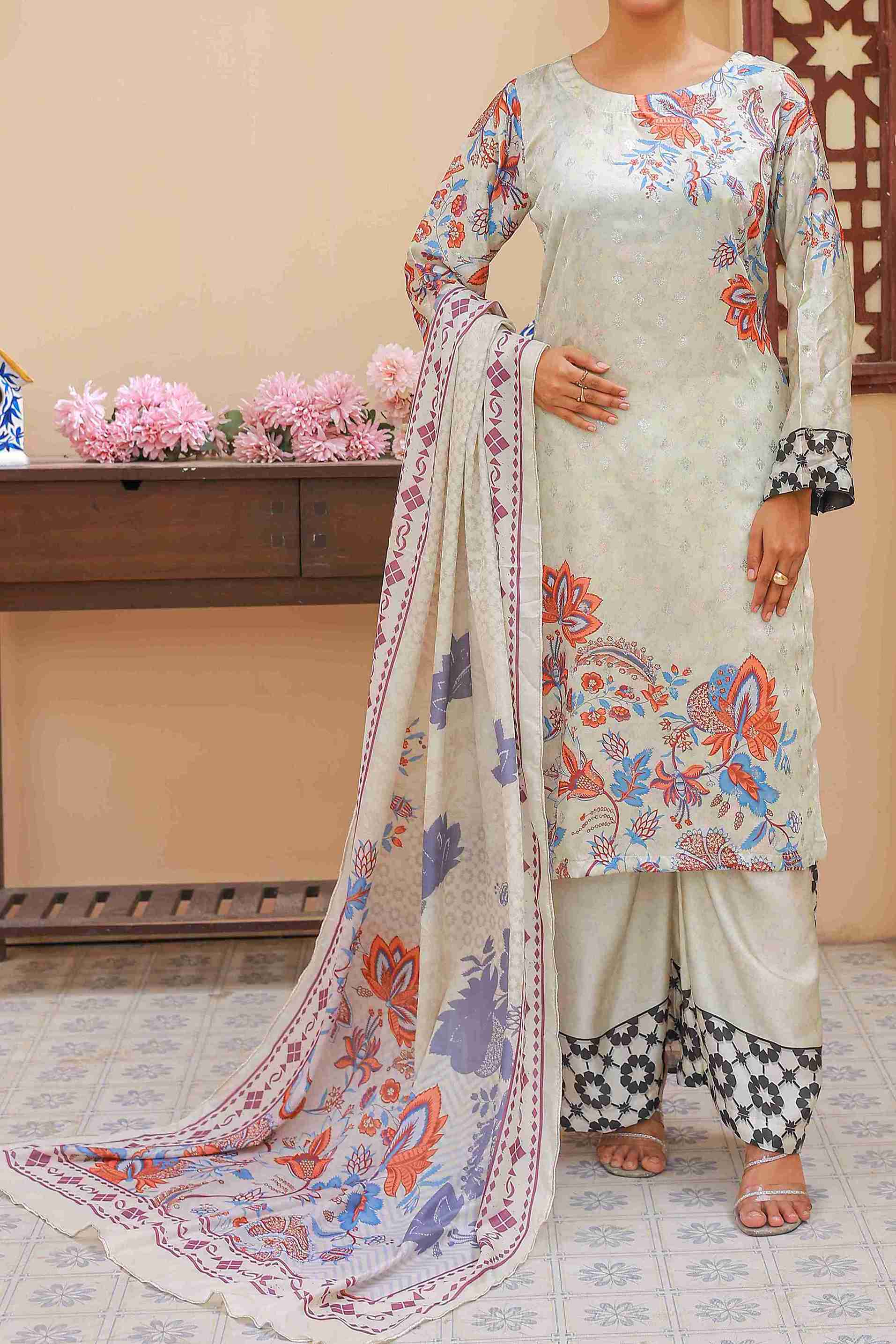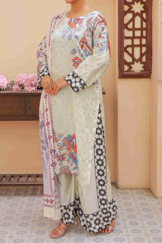 Embrace graceful charm with Cream Flora, a soft and elegant 3‑piece ensemble featuring a delicate cream base adorned with vibrant floral patterns in shades of orange, blue, and lilac. The straight-cut shirt is highlighted with artistic floral sprays and contrasting printed sleeves for a touch of uniqueness. Paired with wide-leg cream trousers showcasing bold black and white geometric floral borders, the look is completed with a matching cream dupatta enhanced by colorful floral designs and fine border detailing for a timeless finish.