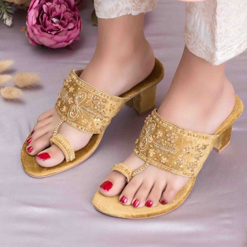 HL-239-Gold a quintessential exemplary kolhapuri of pleasant, luxurious and traditional artistry made on Gold Base with beautiful hand made work. These embroidered shoes heels are the adorable heritages of Pakistan that are hand-sewed by determined cordwainers of rural areas to exhibit the utmost beauty of prepossessing feet.
