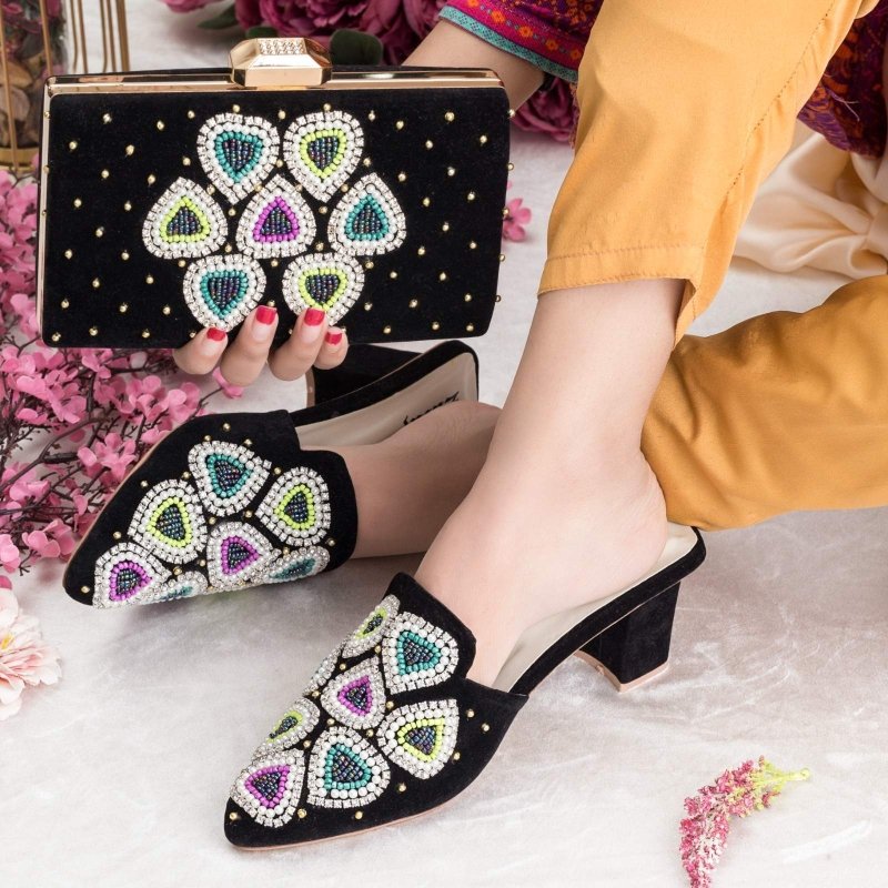 HMC-255-Black is a quintessential exemplary Combination of MULES X CLUTCH on Black base with pleasant, luxurious and traditional artistry. These are the adorable heritages of Pakistan that are hand-sewed by determined cordwainers of rural areas to exhibit the utmost beauty.