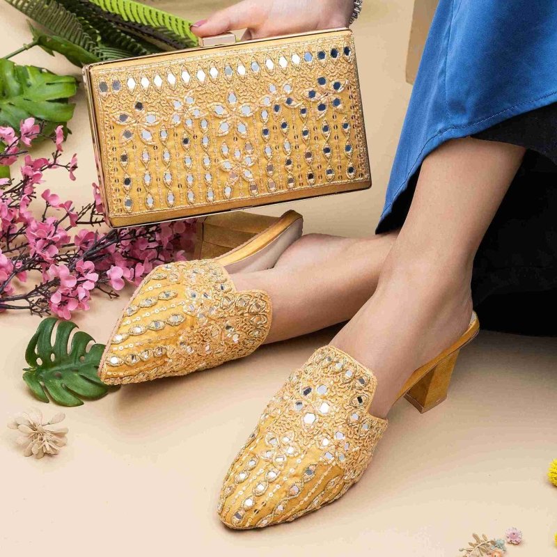 HMC-262-Gold is a quintessential exemplary Combination of MULES X CLUTCH on Gold base with pleasant, luxurious and traditional artistry. These are the adorable heritages of Pakistan that are hand-sewed by determined cordwainers of rural areas to exhibit the utmost beauty.