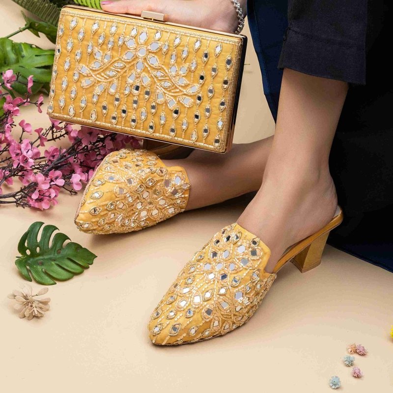 HMC-265-Gold is a quintessential exemplary Combination of MULES X CLUTCH on Gold base with pleasant, luxurious and traditional artistry. These are the adorable heritages of Pakistan that are hand-sewed by determined cordwainers of rural areas to exhibit the utmost beauty.