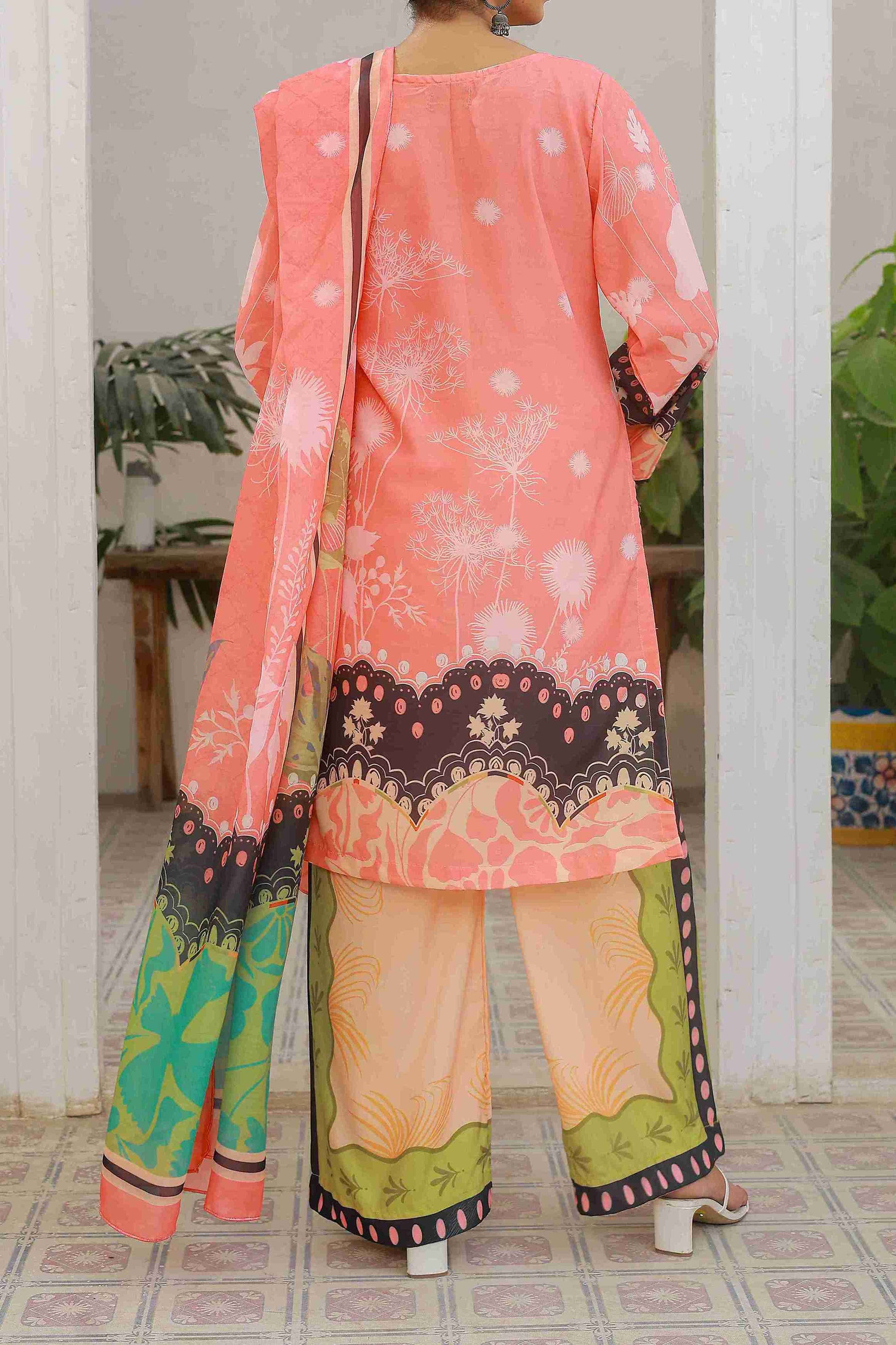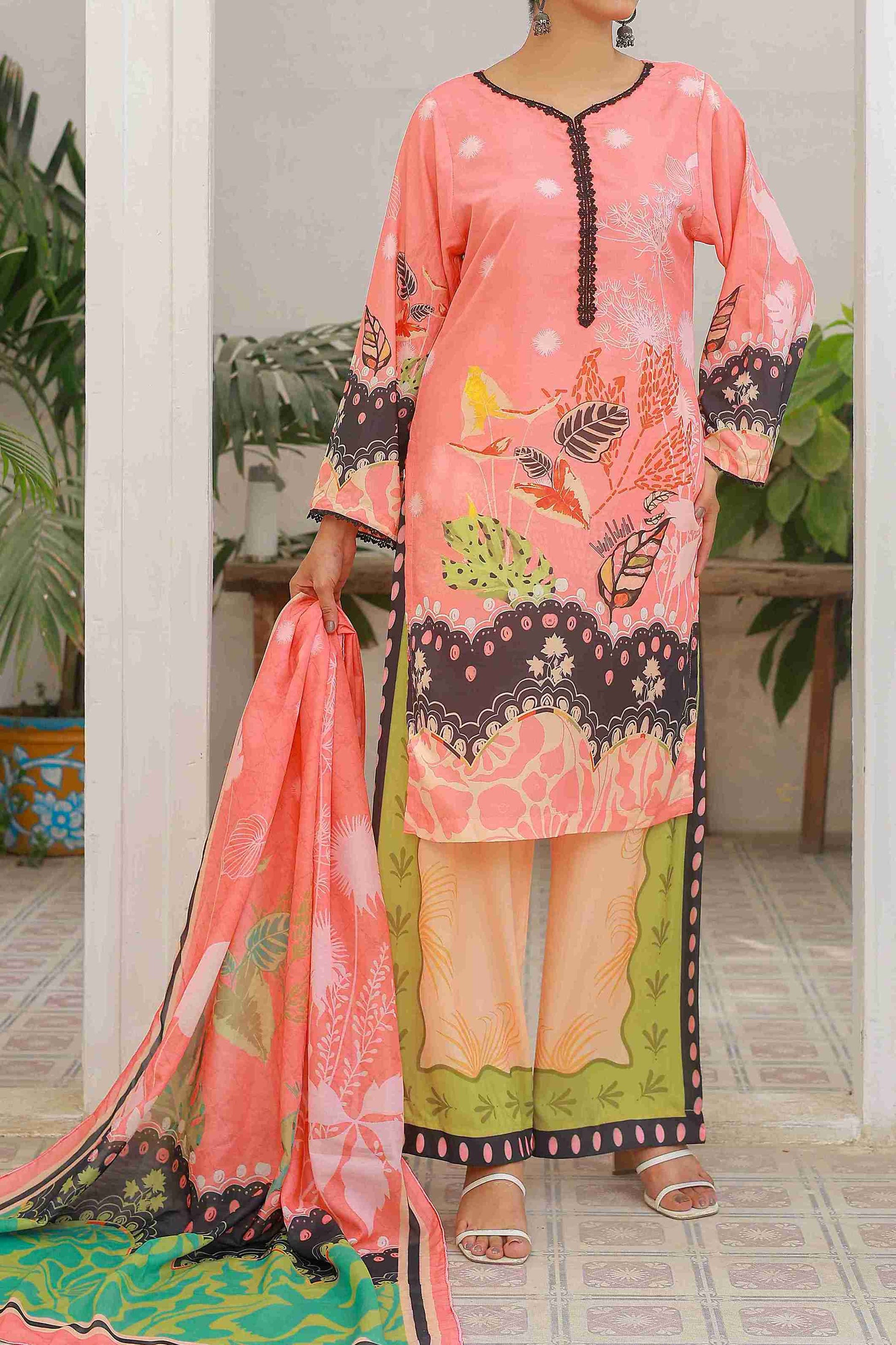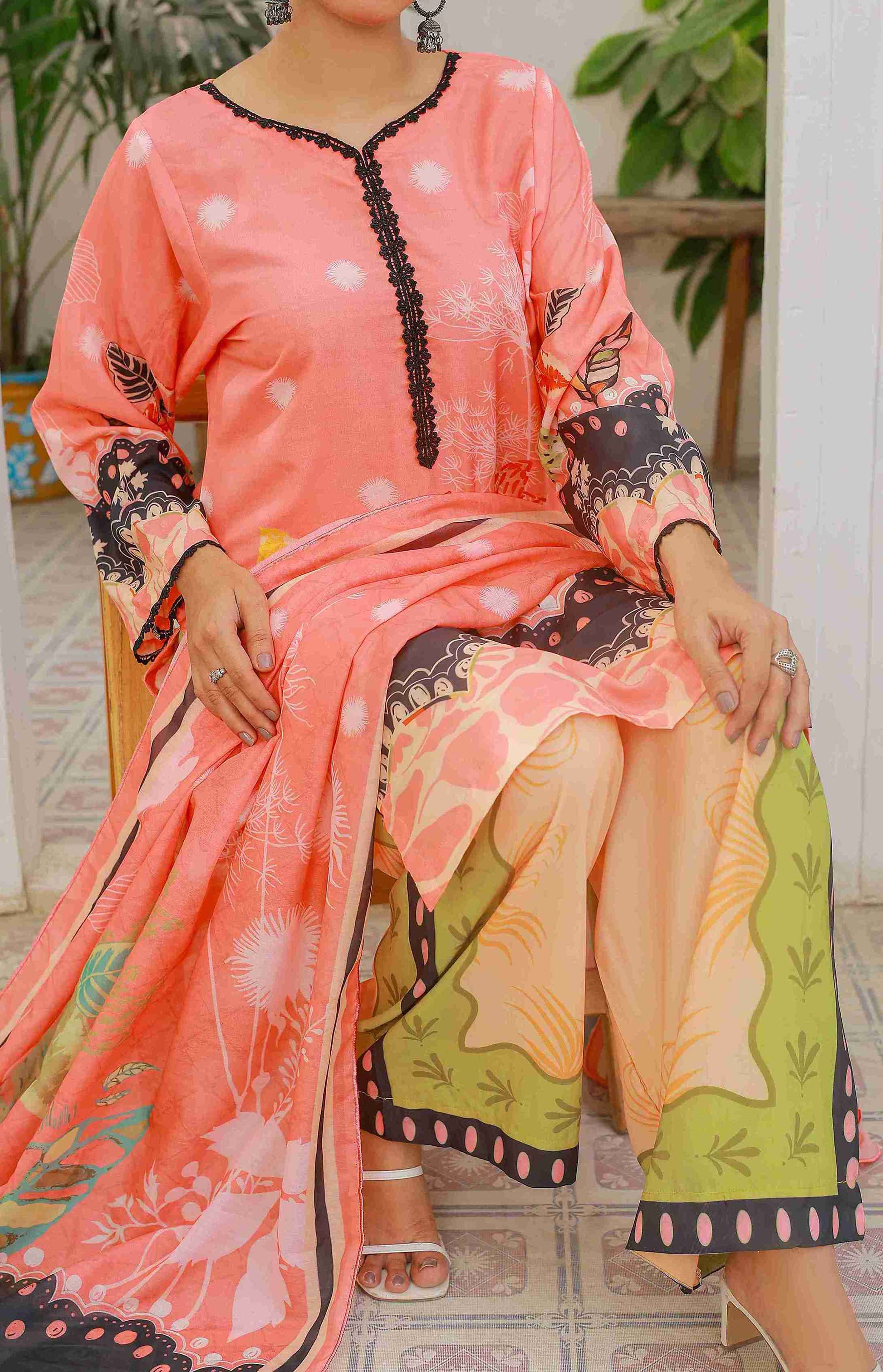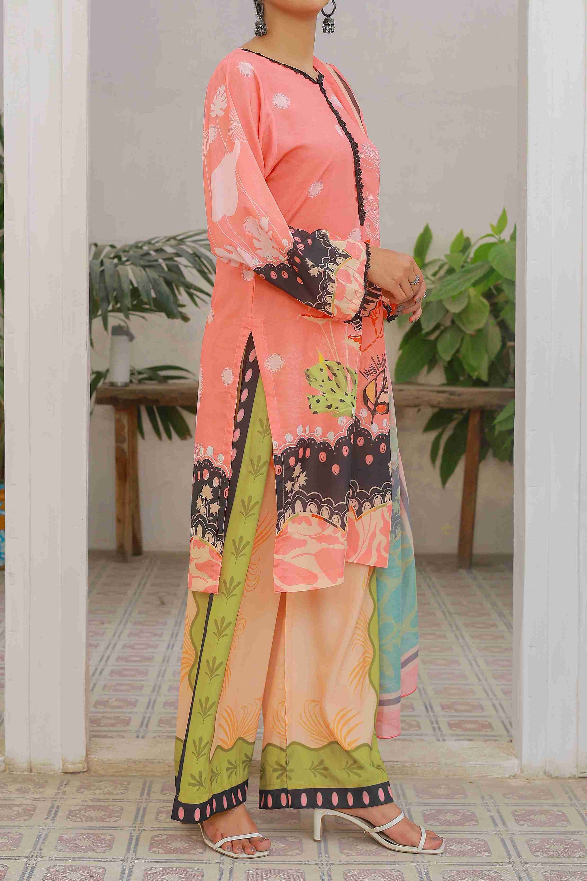 Bring tropical elegance to your wardrobe with Flamingo Bloom, a lively 3‑piece ensemble in a vibrant coral base adorned with playful leaf and floral prints in shades of peach, green, and black. The straight-cut shirt features a mix of tropical motifs and intricate border detailing on the sleeves and hemline, paired with wide-leg trousers in a soft peach tone with leafy green accents for a refreshing twist. Completing the look, the Swiss Voile dupatta flows gracefully with coordinated tropical patterns and a pop of green, making it the perfect statement piece.