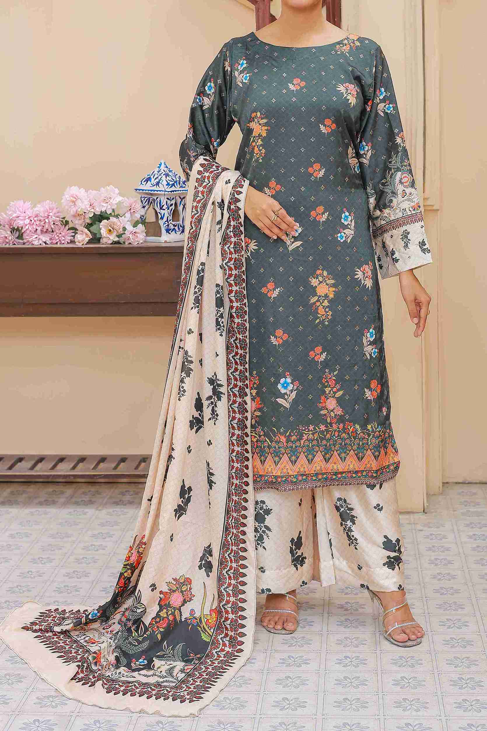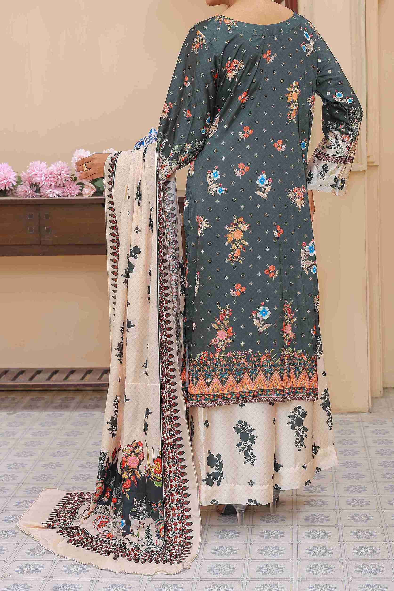 Step into timeless elegance with vintage ivy, a graceful 3‑piece ensemble featuring a deep green base adorned with delicate floral motifs in shades of coral, blue, and ivory. The straight-cut shirt is enhanced with an all-over geometric pattern, soft floral sprays, and a beautifully detailed border hemline. Paired with wide-leg ivory trousers decorated with bold black floral prints, the look is perfectly balanced with a matching ivory dupatta, adorned with intricate floral borders and scattered botanical accents for a refined finish.