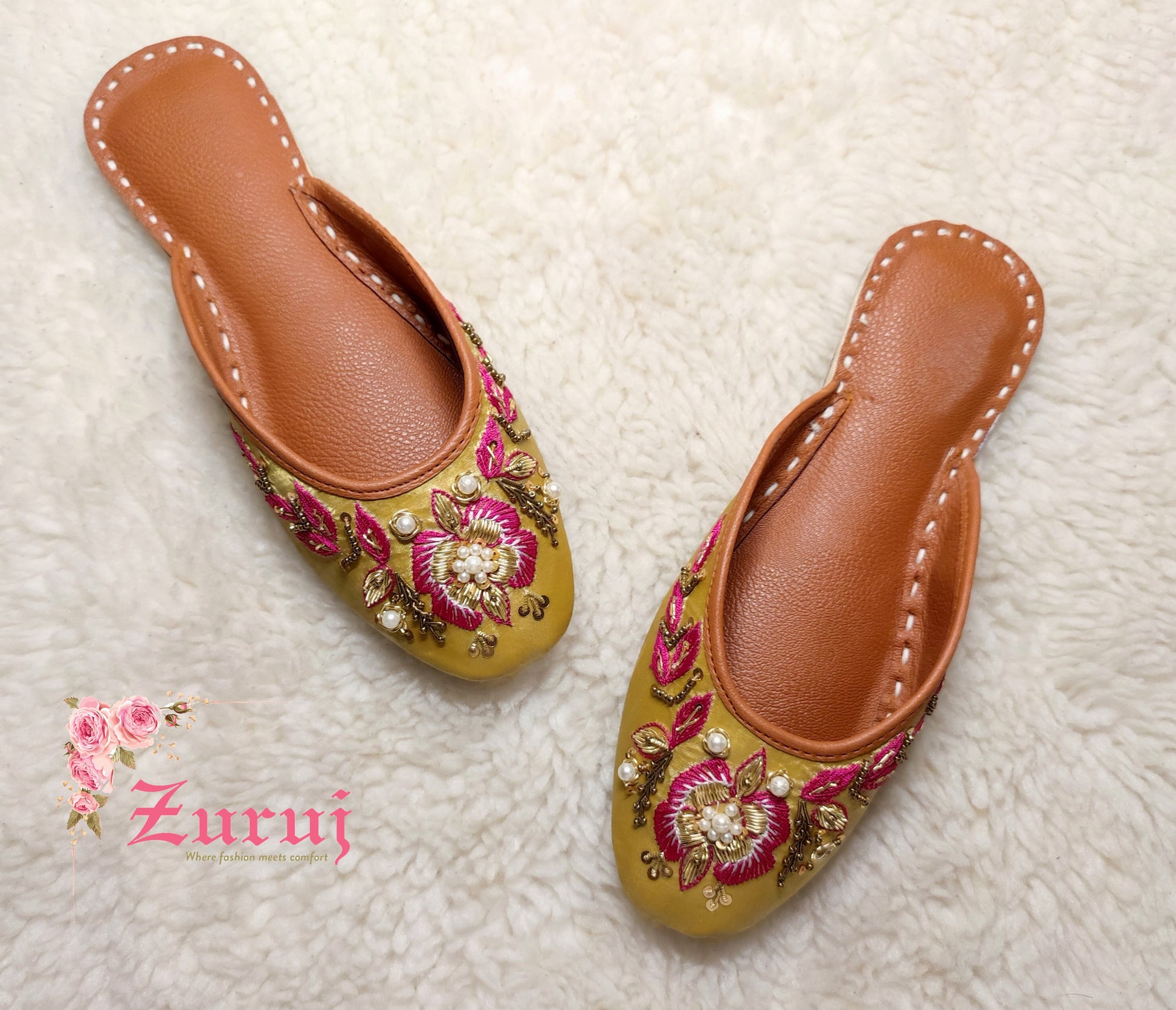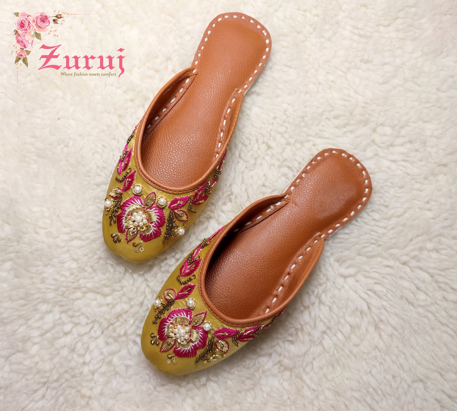 Ju-111 is a quintessential exemplary of pleasant, luxurious and traditional artistry made on Glden color base with beautiful handmade work. These are the adorable heritages of Pakistan that are hand-sewed by determined cordwainers of rural areas to exhibit the utmost beauty of prepossessing feet.