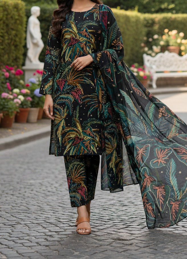 The deep black base is beautifully enhanced with tropical leaf and botanical prints in teal, gold, rust, and muted green tones, creating a rich and contemporary winter look. Designed in a straight, relaxed silhouette and paired with a matching printed dupatta and trouser, this suit blends comfort with standout style.