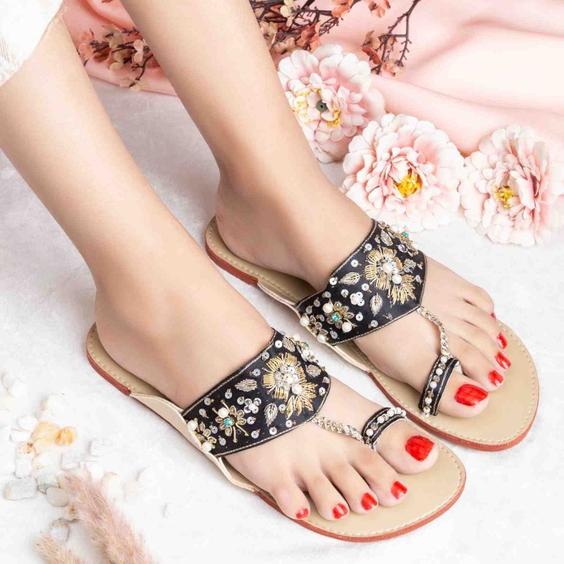KL-13 is a quintessential exemplary of pleasant, luxurious and traditional artistry Kolhapuri made on black base with golden dabka and Green stone work. These are the adorable heritages of Pakistan that are hand-sewed by determined cordwainers of rural areas to exhibit the utmost beauty of prepossessing feet.