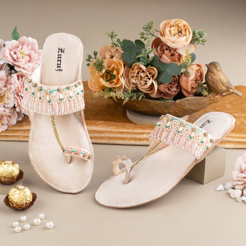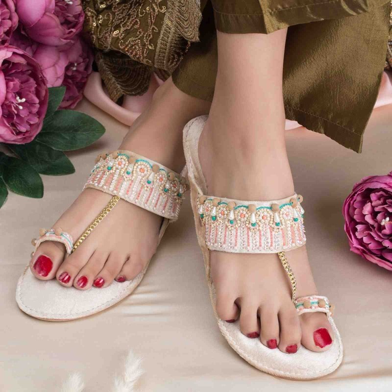 KL-254-Cream is a quintessential exemplary kolhapuri of pleasant, luxurious and traditional artistry made on Cream base with beautiful hand made work. These are the adorable heritages of Pakistan that are hand-sewed by determined cordwainers of rural areas to exhibit the utmost beauty of prepossessing feet.