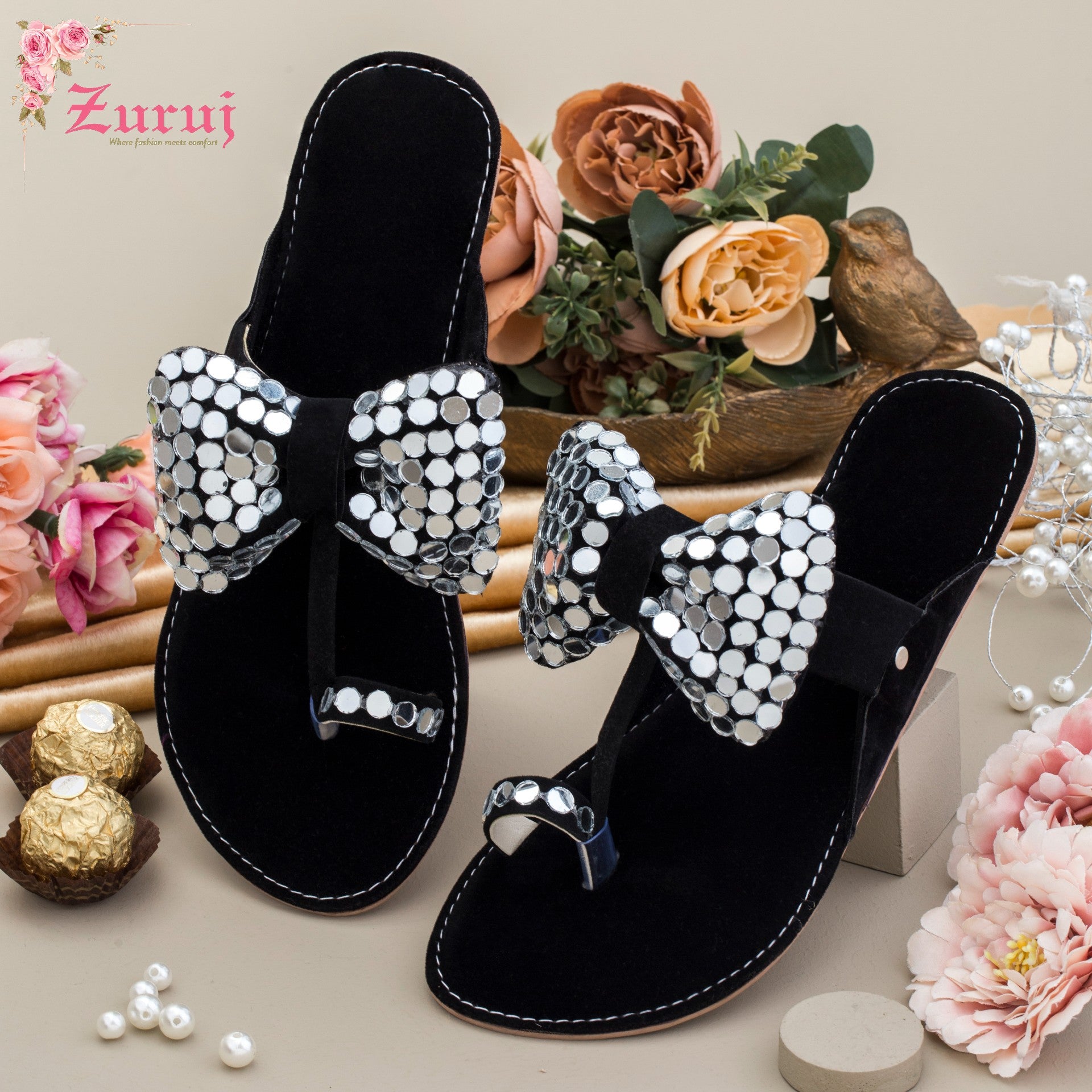 KL-50-Black Bow is a quintessential exemplary kolhapuri of pleasant, luxurious and traditional artistry made on Black base with beautiful hand made work. These are the adorable heritages of Pakistan that are hand-sewed by determined cordwainers of rural areas to exhibit the utmost beauty of prepossessing feet.