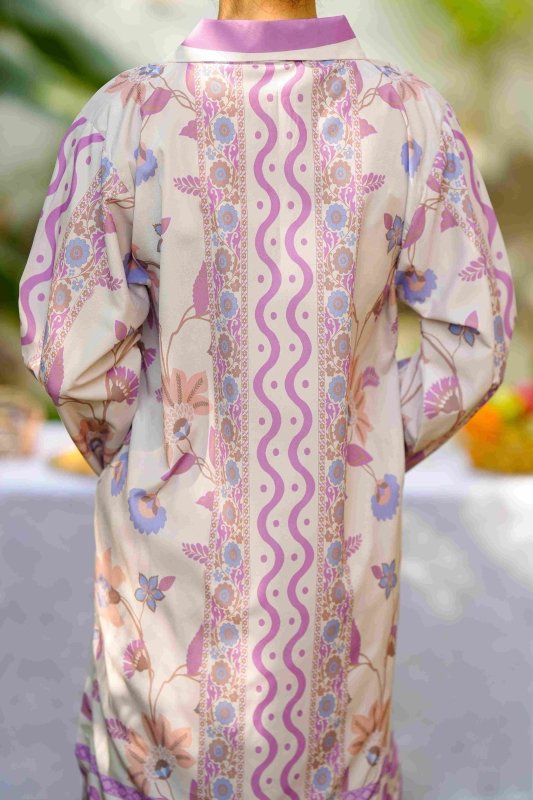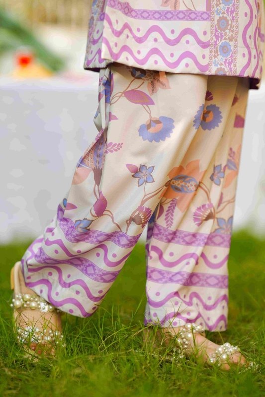 The Lavender Bliss Co-Ord Set features a soft beige base adorned with pastel lavender and muted pink floral motifs, exuding an aura of tranquility. Wavy patterns and intricate border details add a playful yet refined charm. The trousers complement the shirt with coordinating prints, completing this cohesive and stylish look.