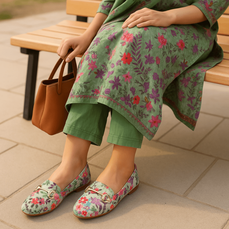 Step into refreshing style with Aqua Bloom – Mint Garden, a pair of lightweight, floral-printed flats designed for everyday comfort and ethnic elegance. Featuring a soft mint green base with vibrant pink, purple, and orange flowers, and accented with a gold buckle, these flats bring a cheerful twist to your casual desi wear. Perfect for summer lawn suits, everyday errands, or weekend outings.
