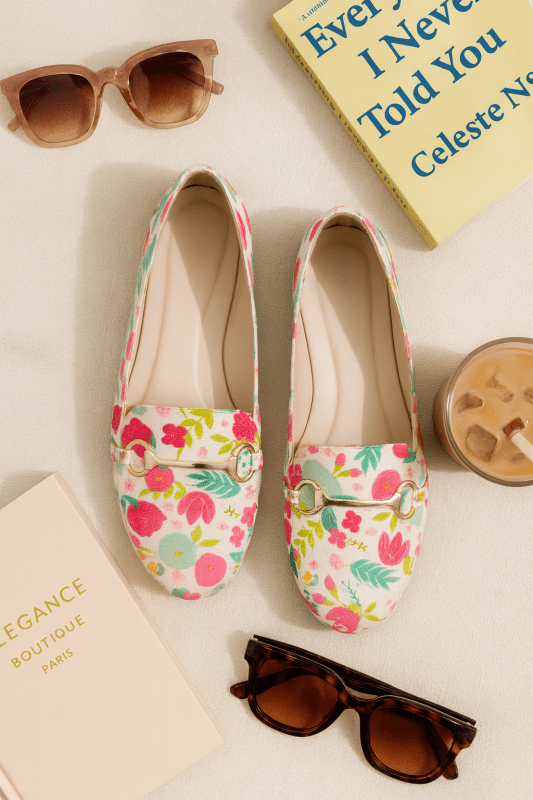 Step into elegance with the BloomCharm loafers – where comfort meets floral finesse. Designed with a soft white canvas and vibrant pastel blooms, these flat shoes are perfect for adding a pop of color to your everyday wardrobe. The gleaming metallic bit embellishment adds a touch of luxury, while the cushioned insole ensures lasting comfort for all-day wear.