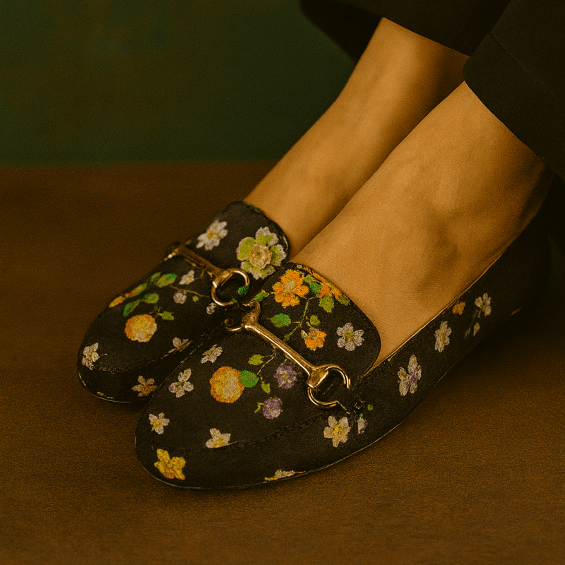 Step into timeless elegance with our Noir Garden Loafers from ZurujWalk – a chic blend of comfort and floral charm. Designed on a deep black canvas with vibrant multicolor blooms, these flats add a bold, feminine touch to any outfit. The gold-toned horsebit detail adds a hint of sophistication, making them ideal for casual brunches, festive gatherings, or daily errands.