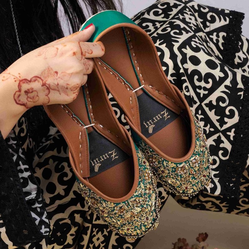 Rich, timeless glamour. This handcrafted women’s khussa features a deep emerald/teal base drenched in antique-gold zardozi with crystal and bead accents for a high-sparkle finish. A cushioned insole and flexible flat sole keep you comfy from mehndi to midnight.