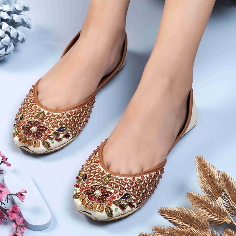 Hand-embellished ivory khussa with multicolor beads, crystals, and zari work. The rich floral motif and lattice beading add bridal-level sparkle, while the cushioned insole and flexible flat sole keep you comfy through mehndi to walima.