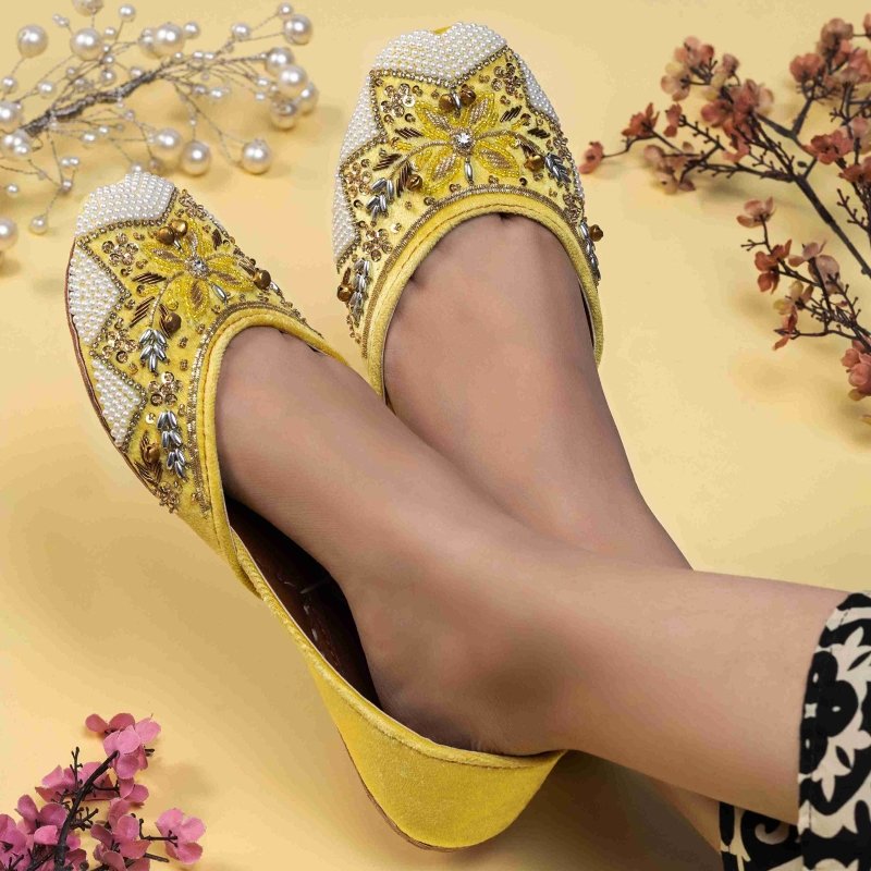 Bright, festive, and eye-catching. This handcrafted women’s khussa features a sunny marigold velvet base with floral handwork, shimmering crystals, and silver/gold bead leaves. The toe is finished with luxe white pearl beading in a chevron pattern. A cushioned insole and flexible flat sole keep you comfy from mehndi to midnight.