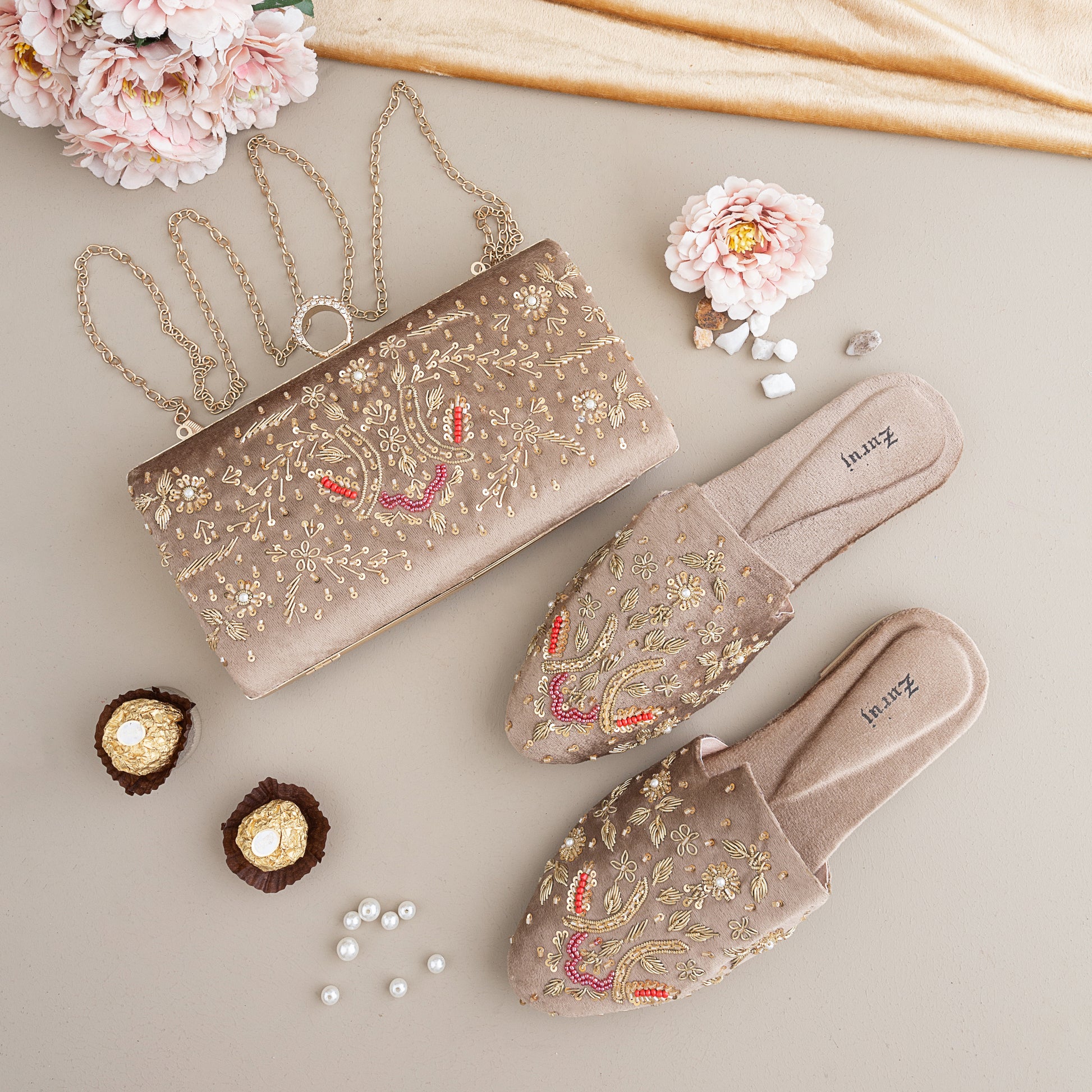 MC-237-CHIKOO is a quintessential exemplary Combination of MULES X CLUTCH on CHIKOO base with pleasant, luxurious and traditional artistry. These are the adorable heritages of Pakistan that are hand-sewed by determined cordwainers of rural areas to exhibit the utmost beauty.