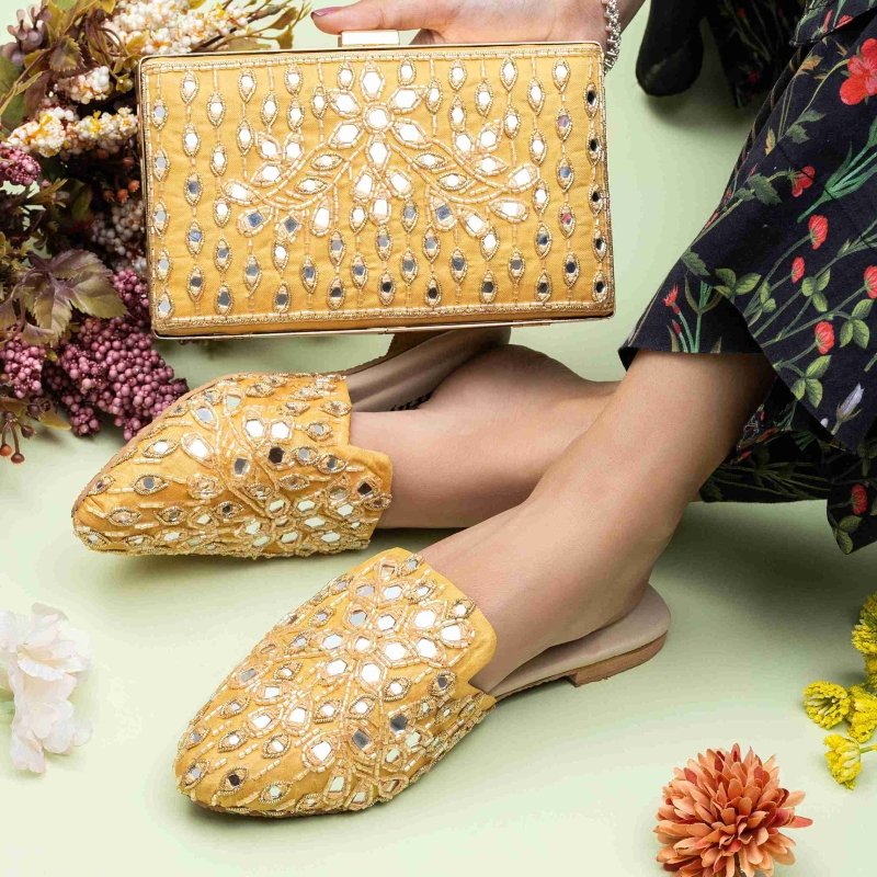 MC-265-Gold is a quintessential exemplary Combination of MULES X CLUTCH on Gold base with pleasant, luxurious and traditional artistry. These are the adorable heritages of Pakistan that are hand-sewed by determined cordwainers of rural areas to exhibit the utmost beauty.
