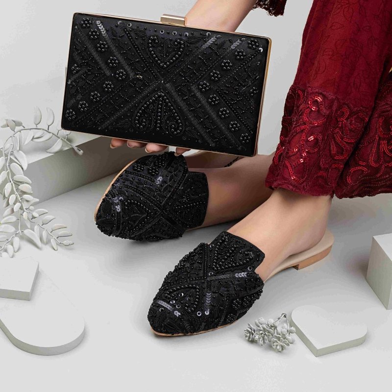 MC-284-Black is a quintessential exemplary Combination of MULES X CLUTCH with pleasant, luxurious and traditional artistry. These are the adorable heritages of Pakistan that are hand-sewed by determined cordwainers of rural areas to exhibit the utmost beauty.