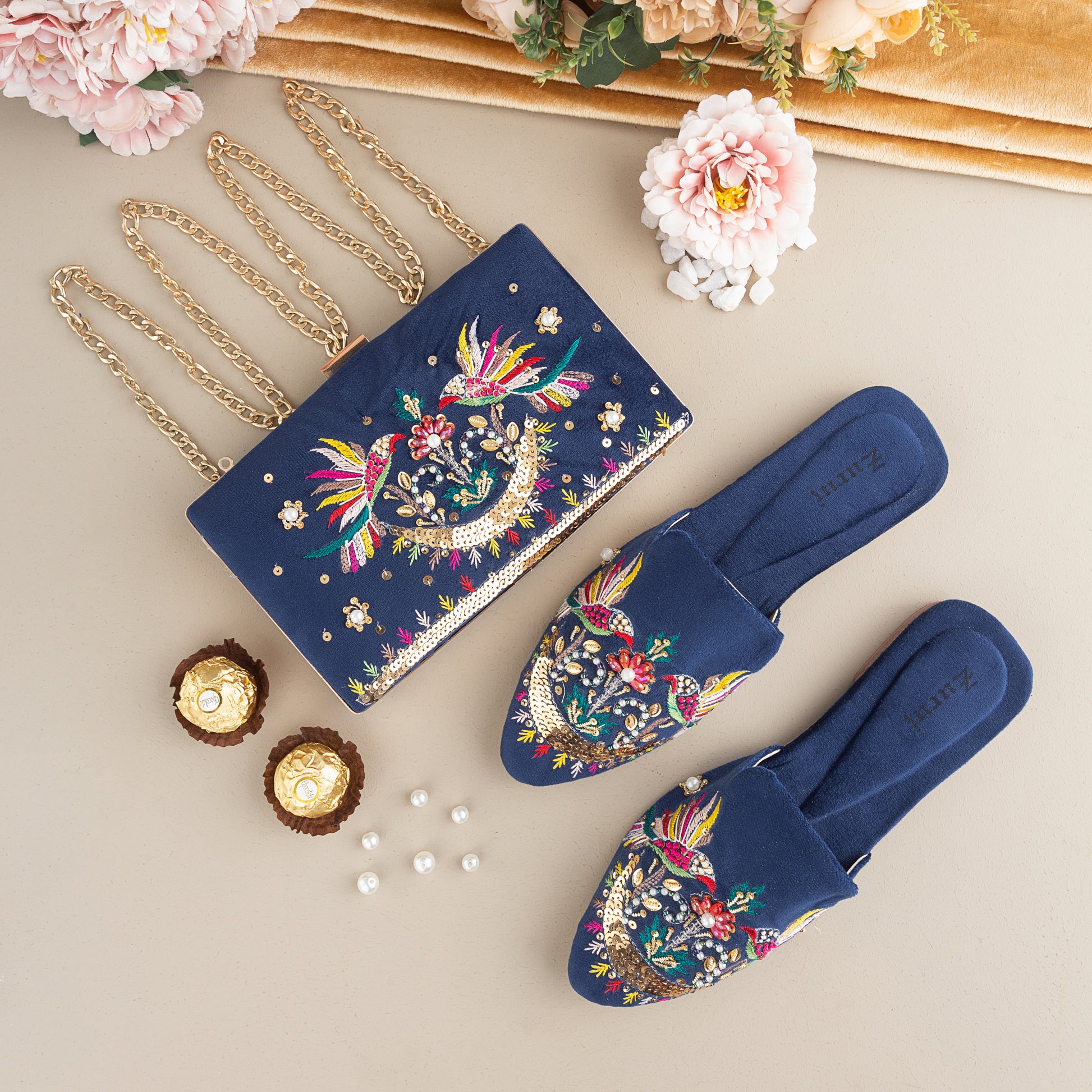 MC-41-NAVY BLUE is a quintessential exemplary Combination of MULES X CLUTCH on Navy Blue base with pleasant, luxurious and traditional artistry. These are the adorable heritages of Pakistan that are hand-sewed by determined cordwainers of rural areas to exhibit the utmost beauty.