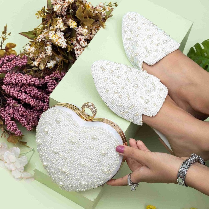 MC-BS9-White is a quintessential exemplary Combination of MULES X CLUTCH on White base with pleasant, luxurious and traditional artistry. These are the adorable heritages of Pakistan that are hand-sewed by determined cordwainers of rural areas to exhibit the utmost beauty.