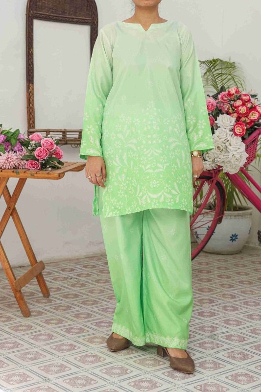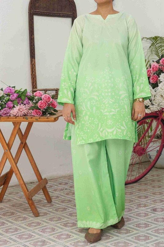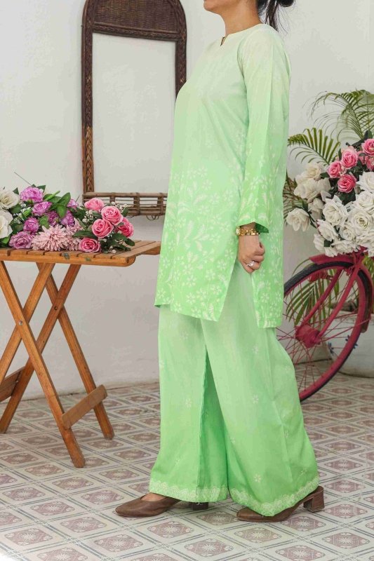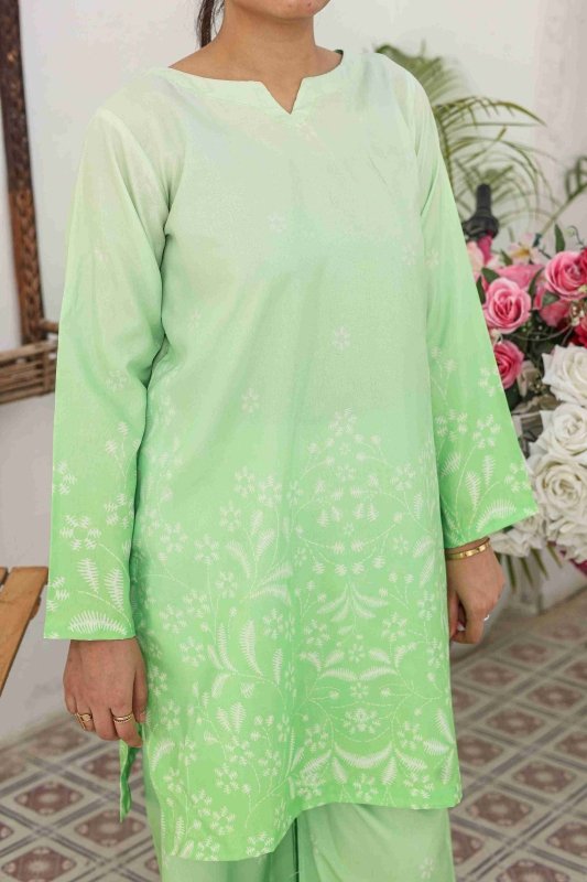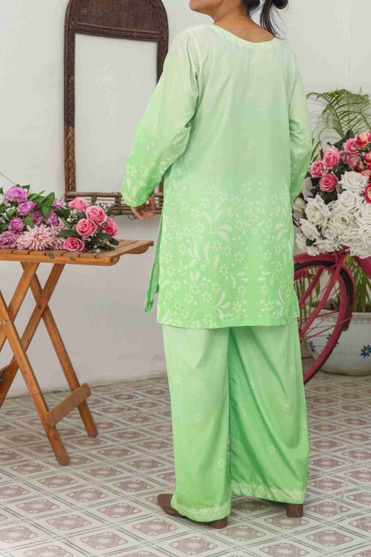 Refresh your wardrobe with the elegance of Mint Glow, a pastel green co-ord set designed to blend comfort and style. Made from premium Russian silk fabric, this outfit offers a soft, breathable, and flowy texture perfect for all-day wear. The shirt features intricate floral patterns with a graceful fade-out effect, paired with matching wide-leg trousers that ensure a modern yet modest silhouette.