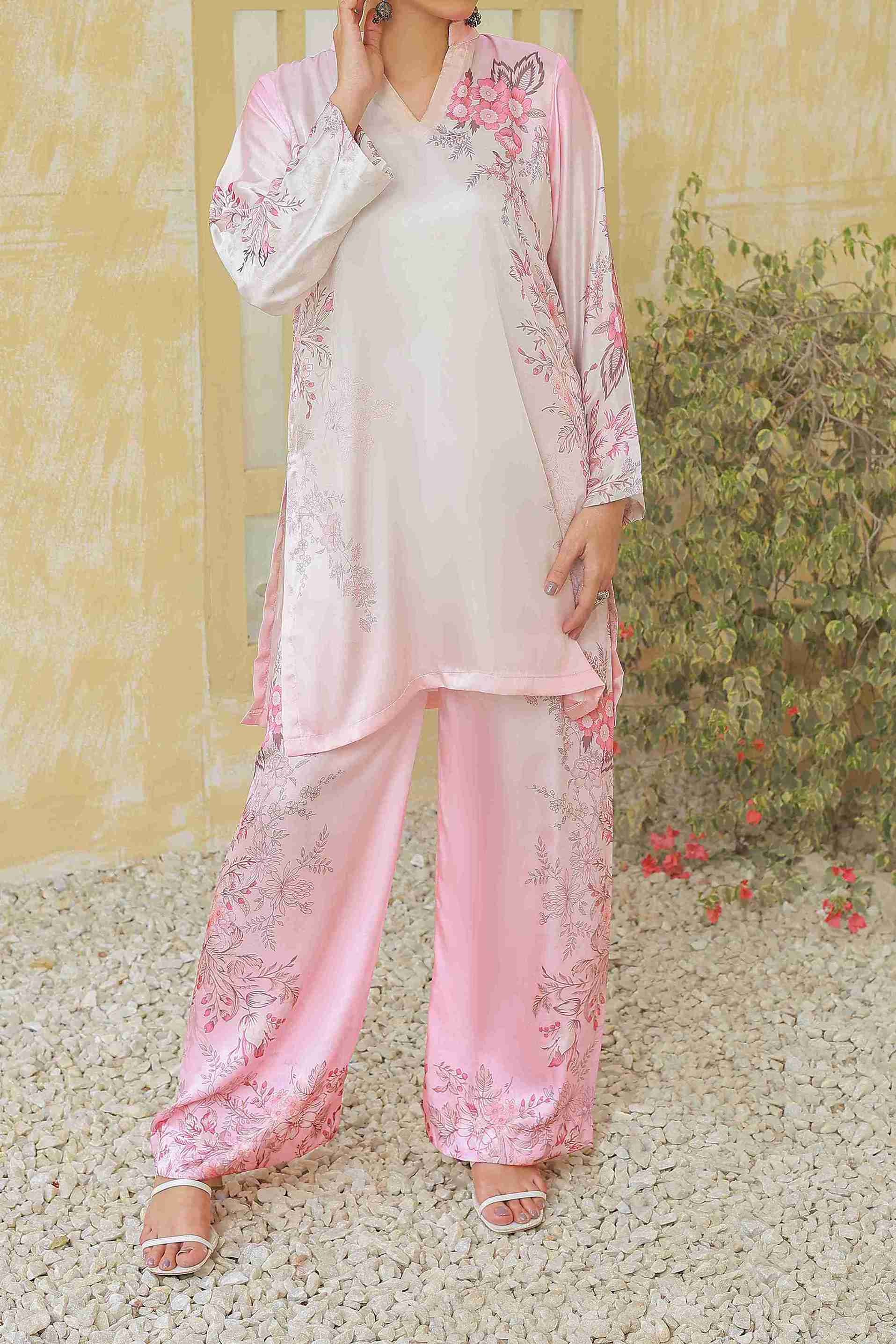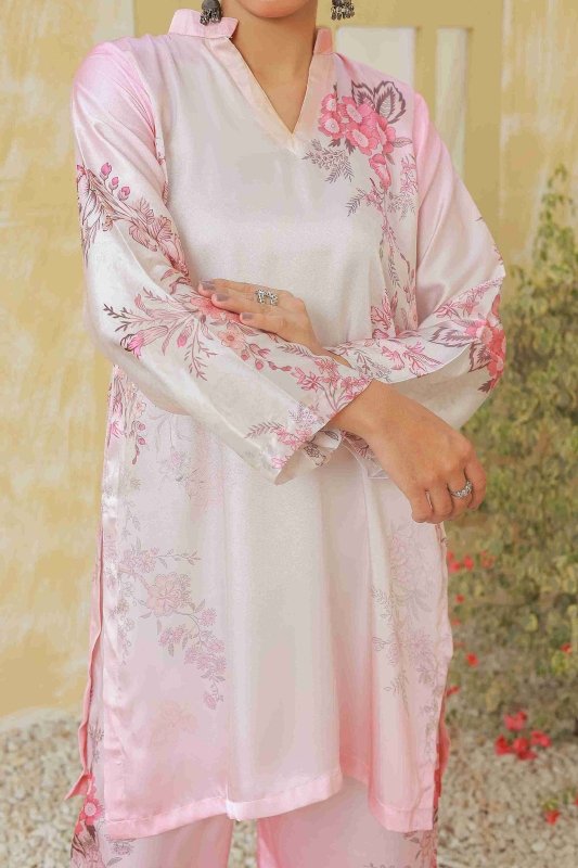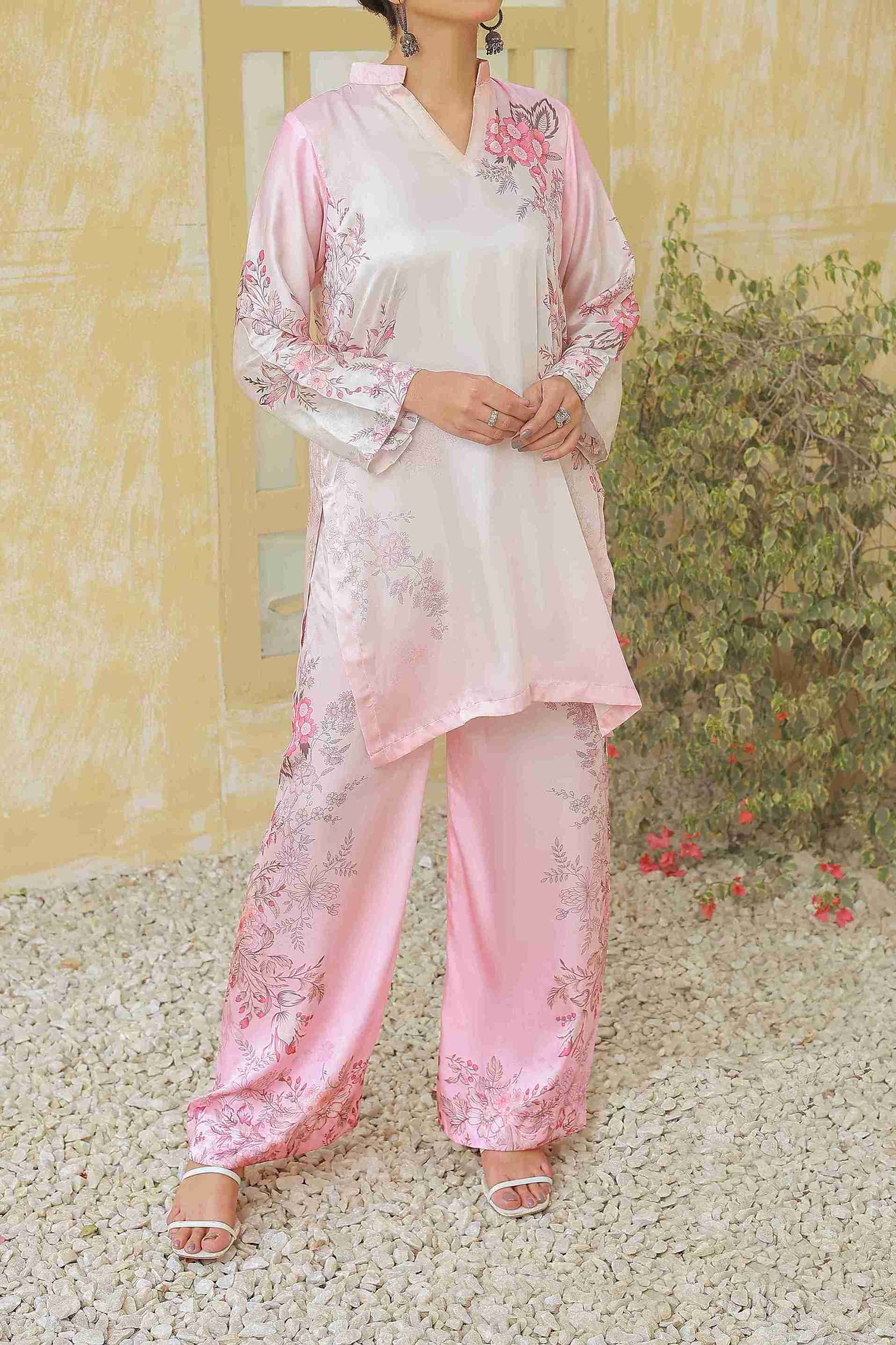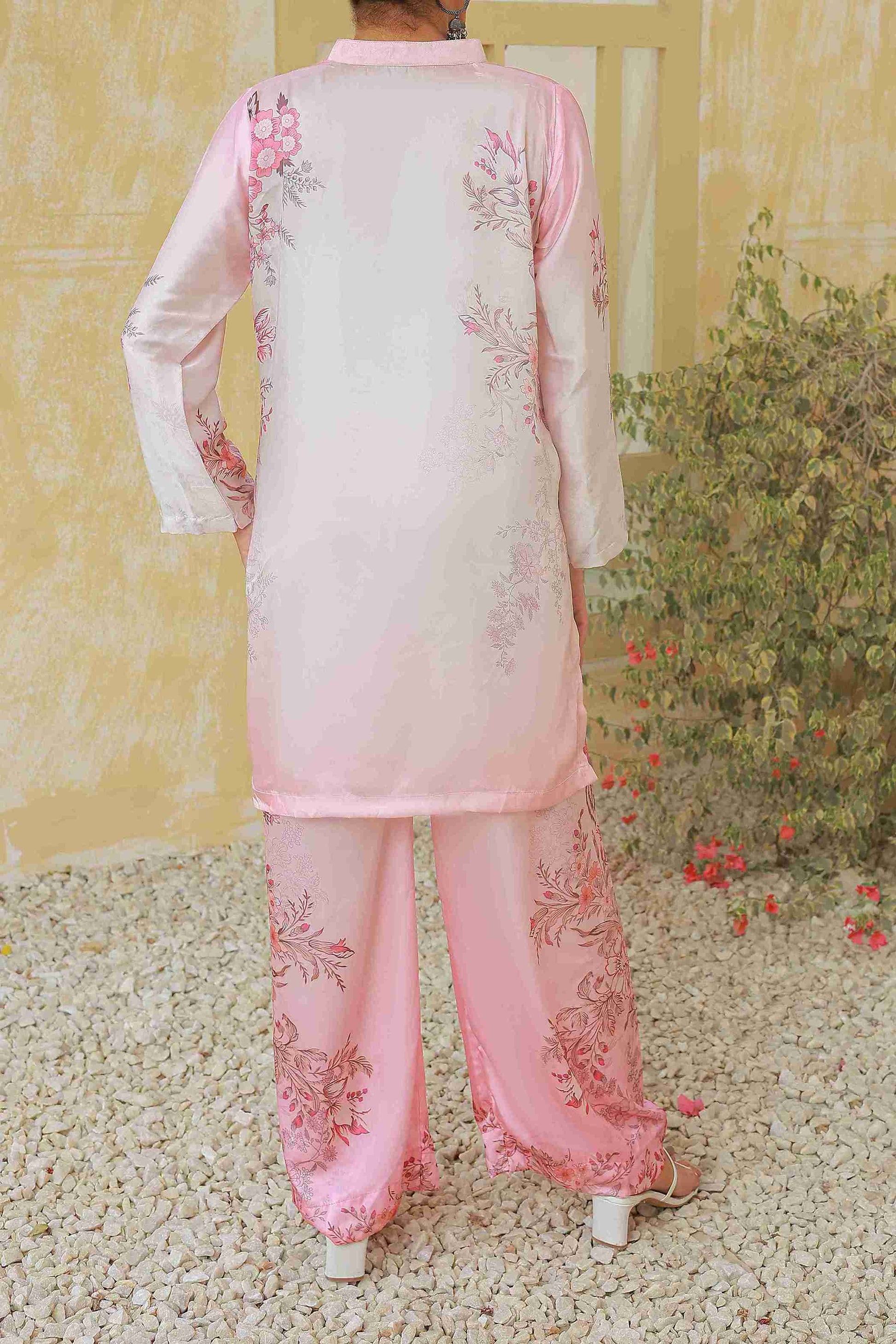 Step into feminine elegance with Pink Petals, a graceful 2‑piece ensemble in a soft blush pink base, adorned with delicate floral motifs in shades of rose, mauve, and silver. The shirt features a flattering V‑neckline with minimal collar detailing, complemented by floral accents along the sleeves and hem. Paired with wide-leg trousers in matching blush pink, enhanced by floral patterns along the sides and hemline, this outfit exudes charm and sophistication.