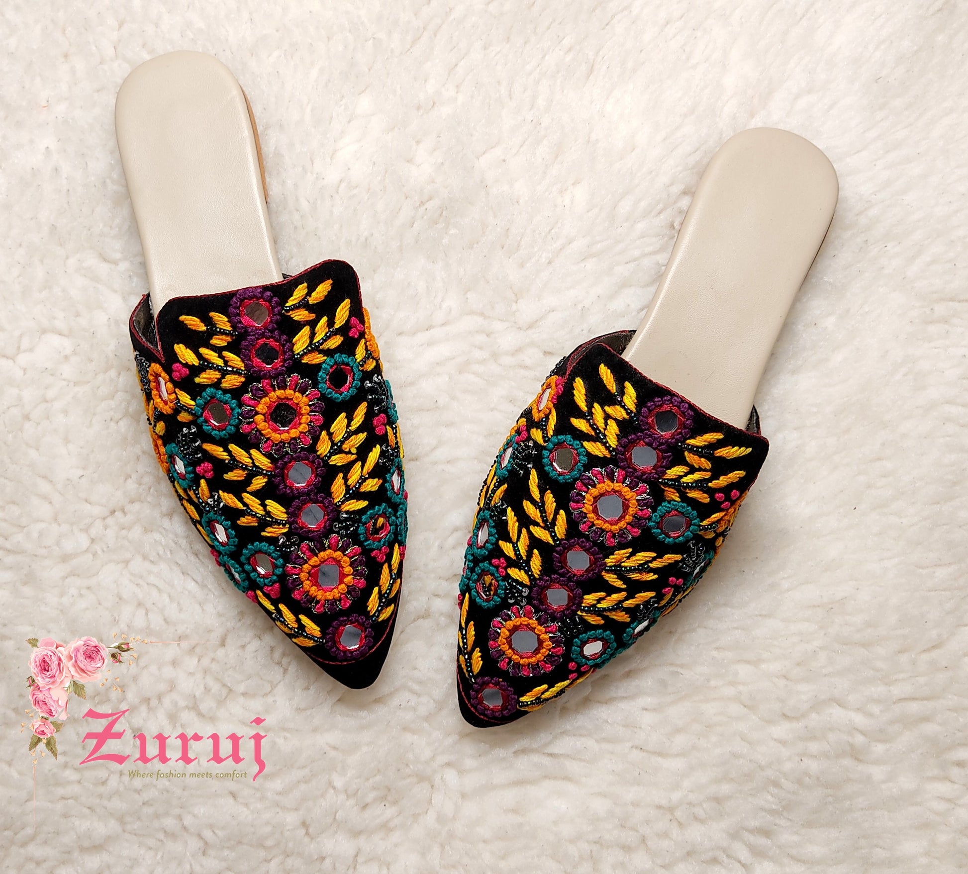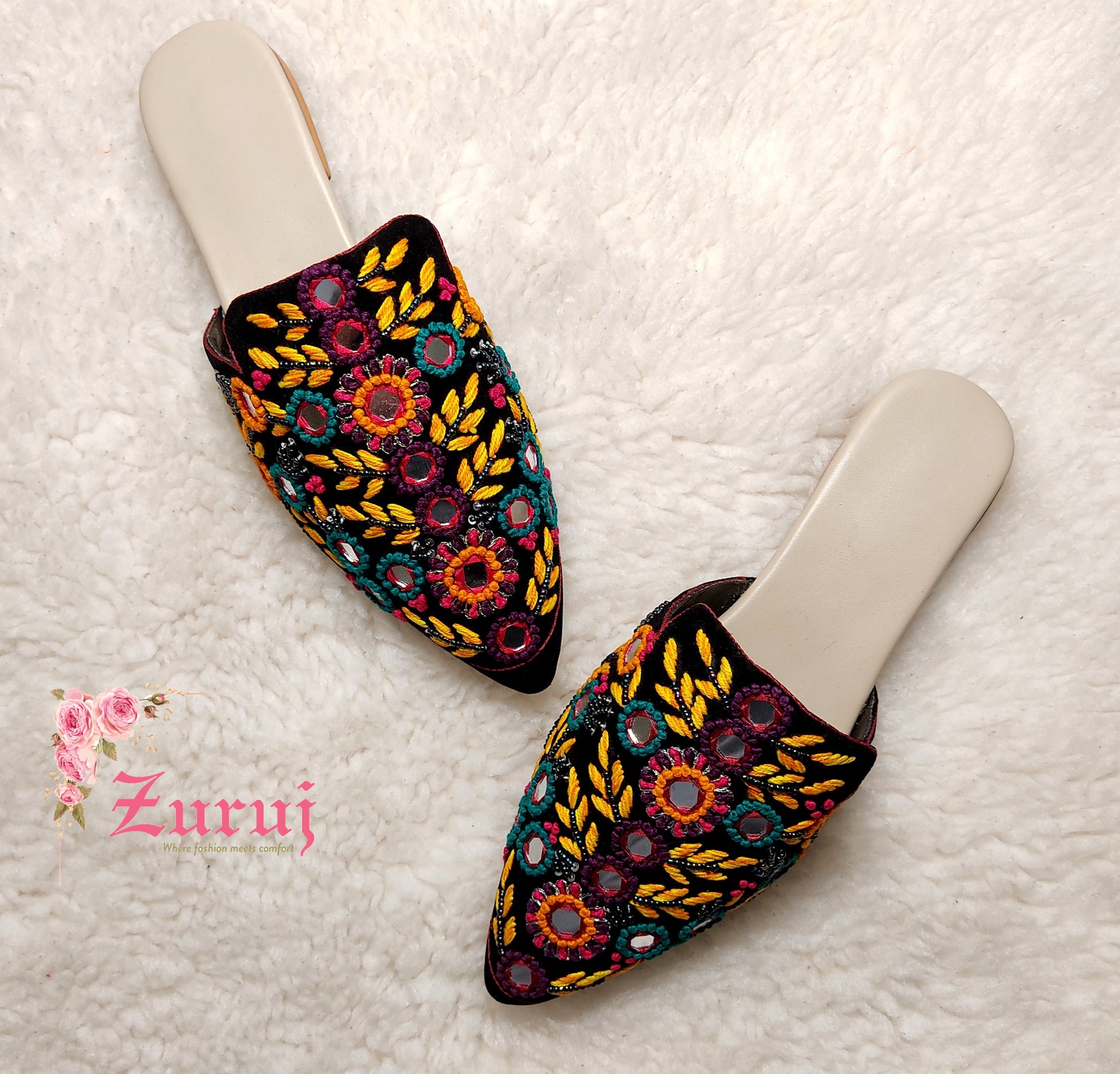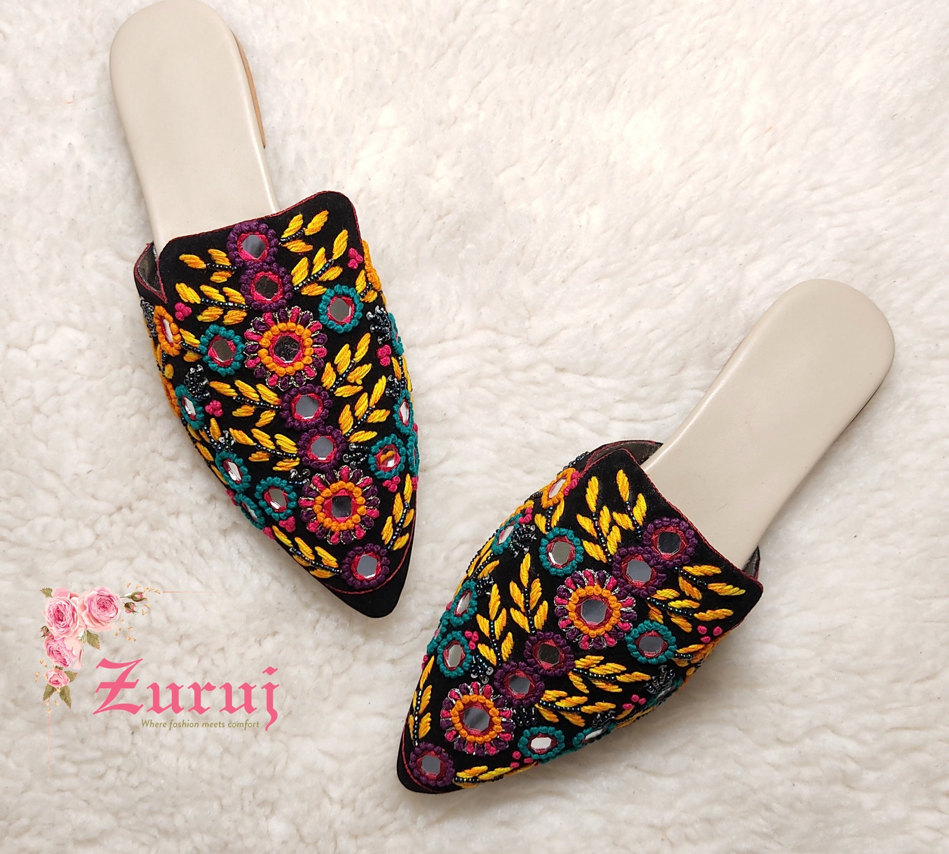 ML-135 is a quintessential exemplary of pleasant, luxurious and traditional artistry made on Black base with beautiful combination multi color embroidery work. These are the adorable heritages of Pakistan that are hand-sewed by determined cordwainers of rural areas to exhibit the utmost beauty of prepossessing feet.