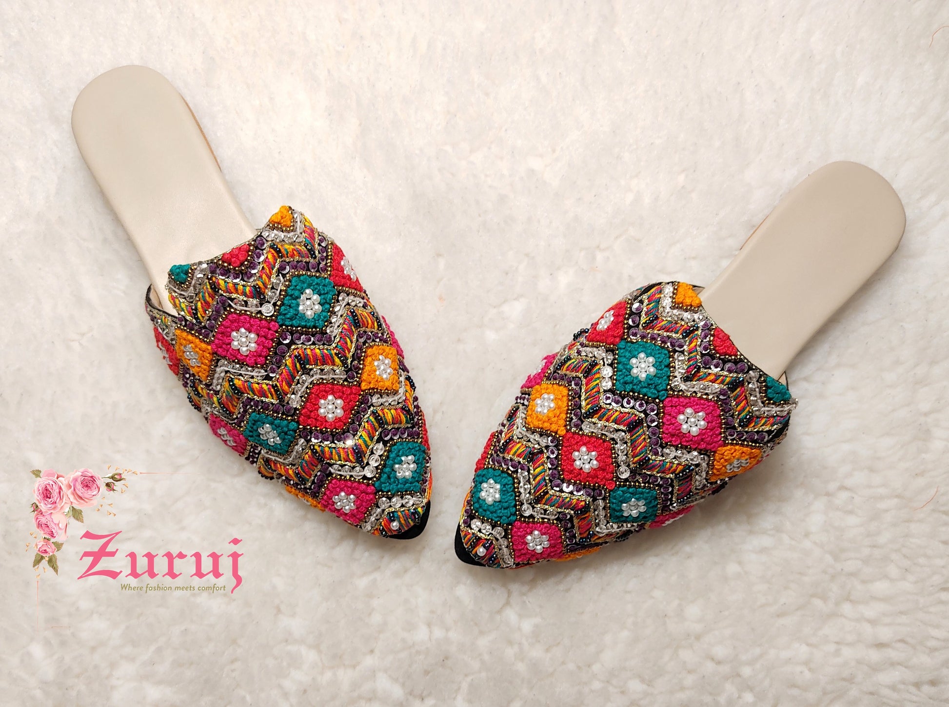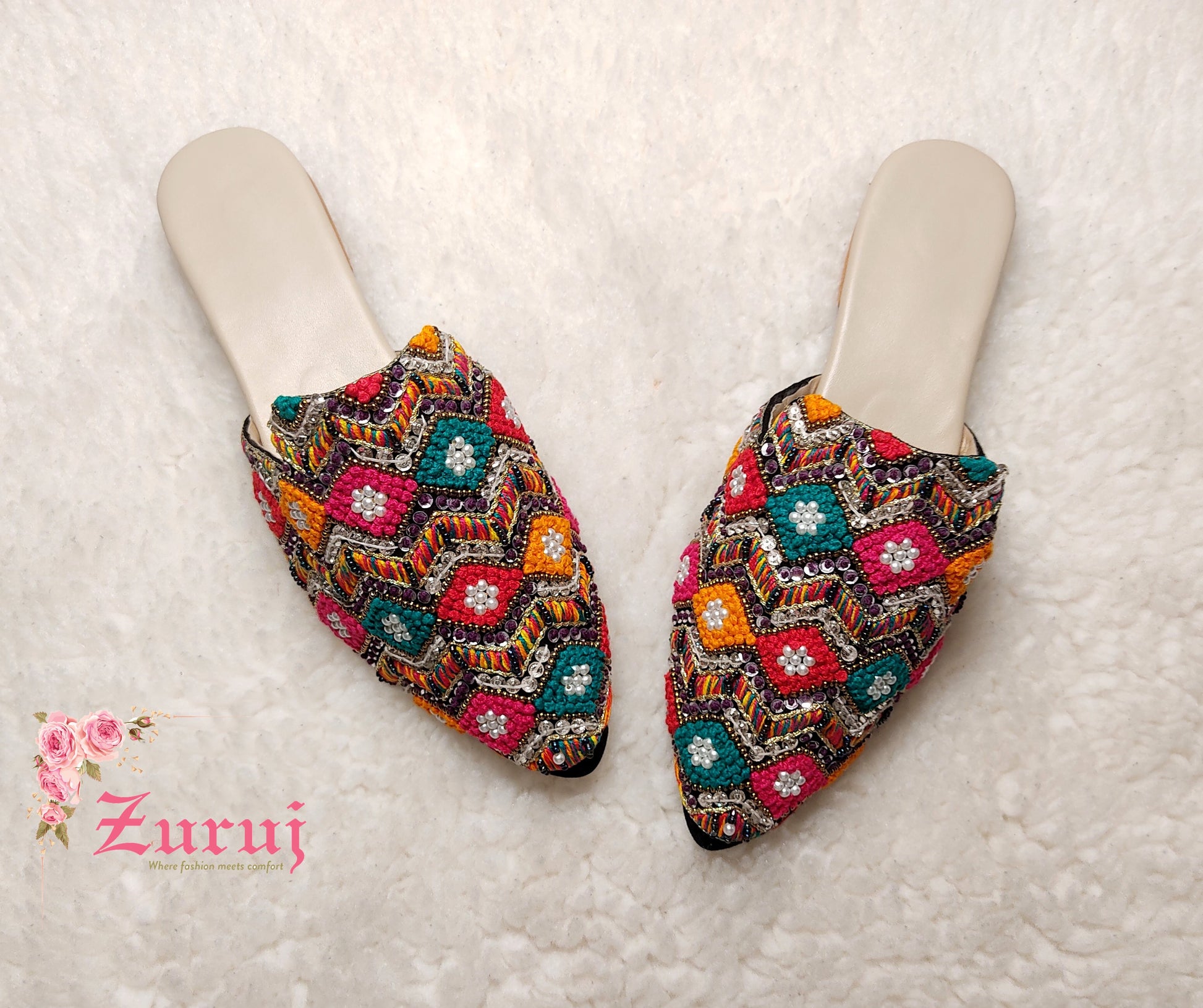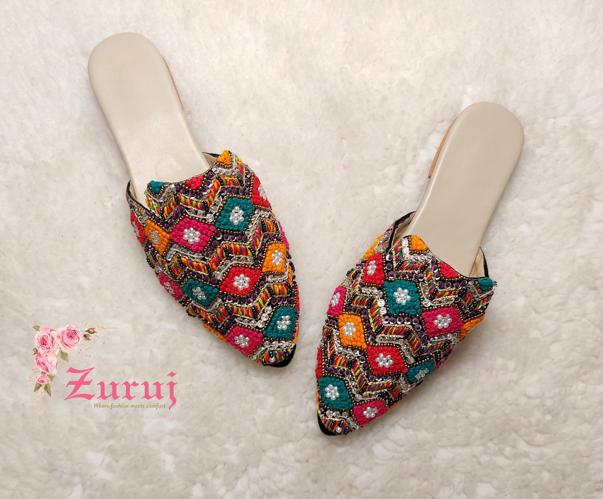 ML-36 is a quintessential exemplary of pleasant, luxurious and traditional artistry made on Black base with beautiful combination multi color embroidery anchor work. These are the adorable heritages of Pakistan that are hand-sewed by determined cordwainers of rural areas to exhibit the utmost beauty of prepossessing feet.