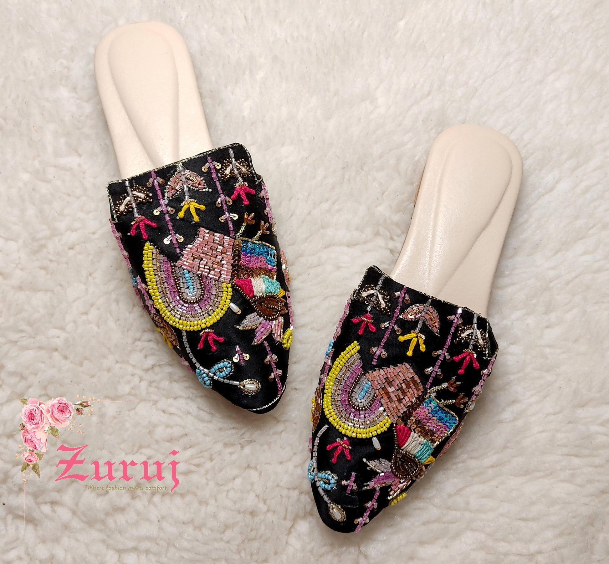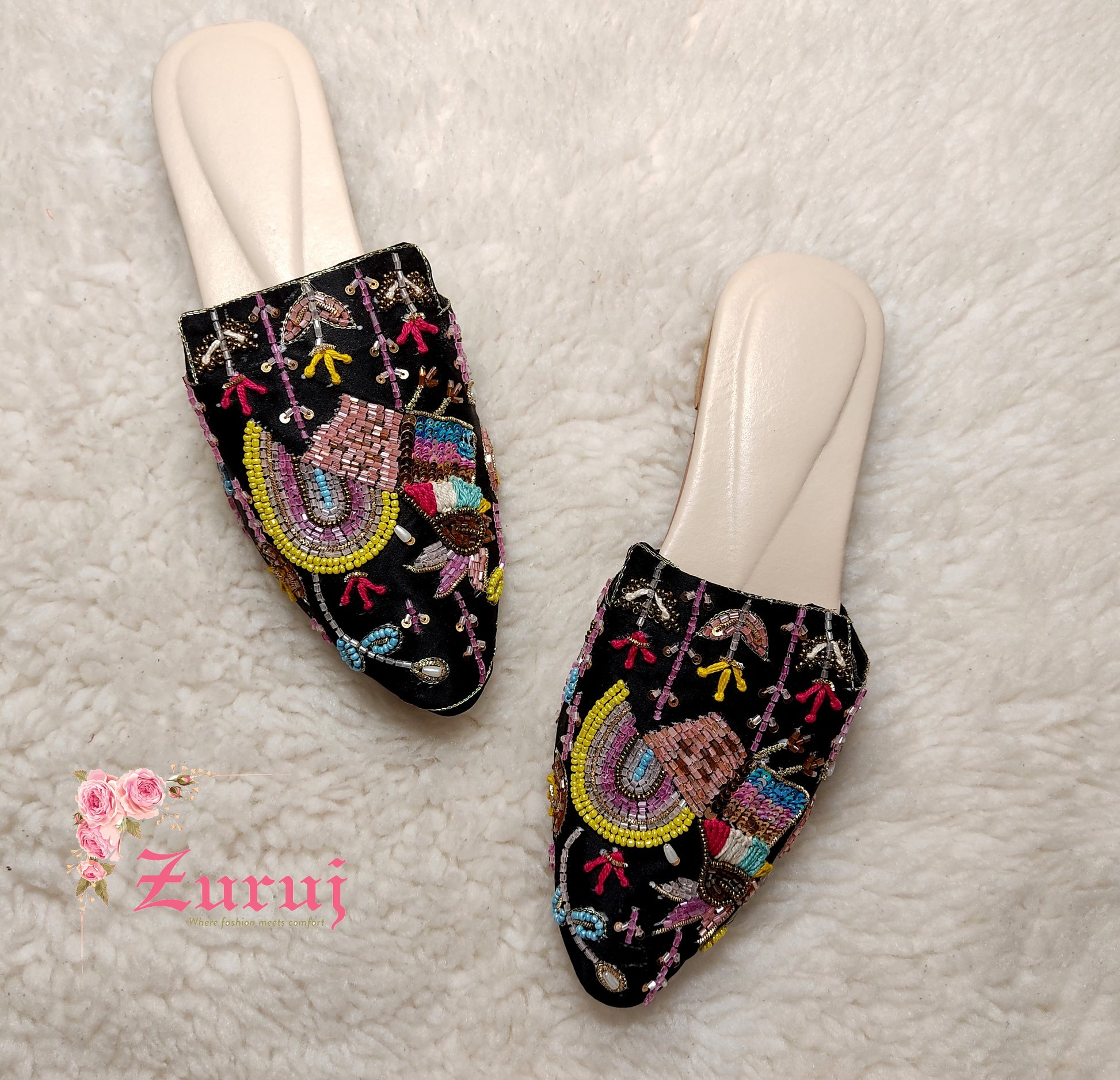 ML-9-Black is a quintessential exemplary of pleasant, luxurious and traditional artistry made on White base with beautiful combination multi color embroidery work. These are the adorable heritages of Pakistan that are hand-sewed by determined cordwainers of rural areas to exhibit the utmost beauty of prepossessing feet.