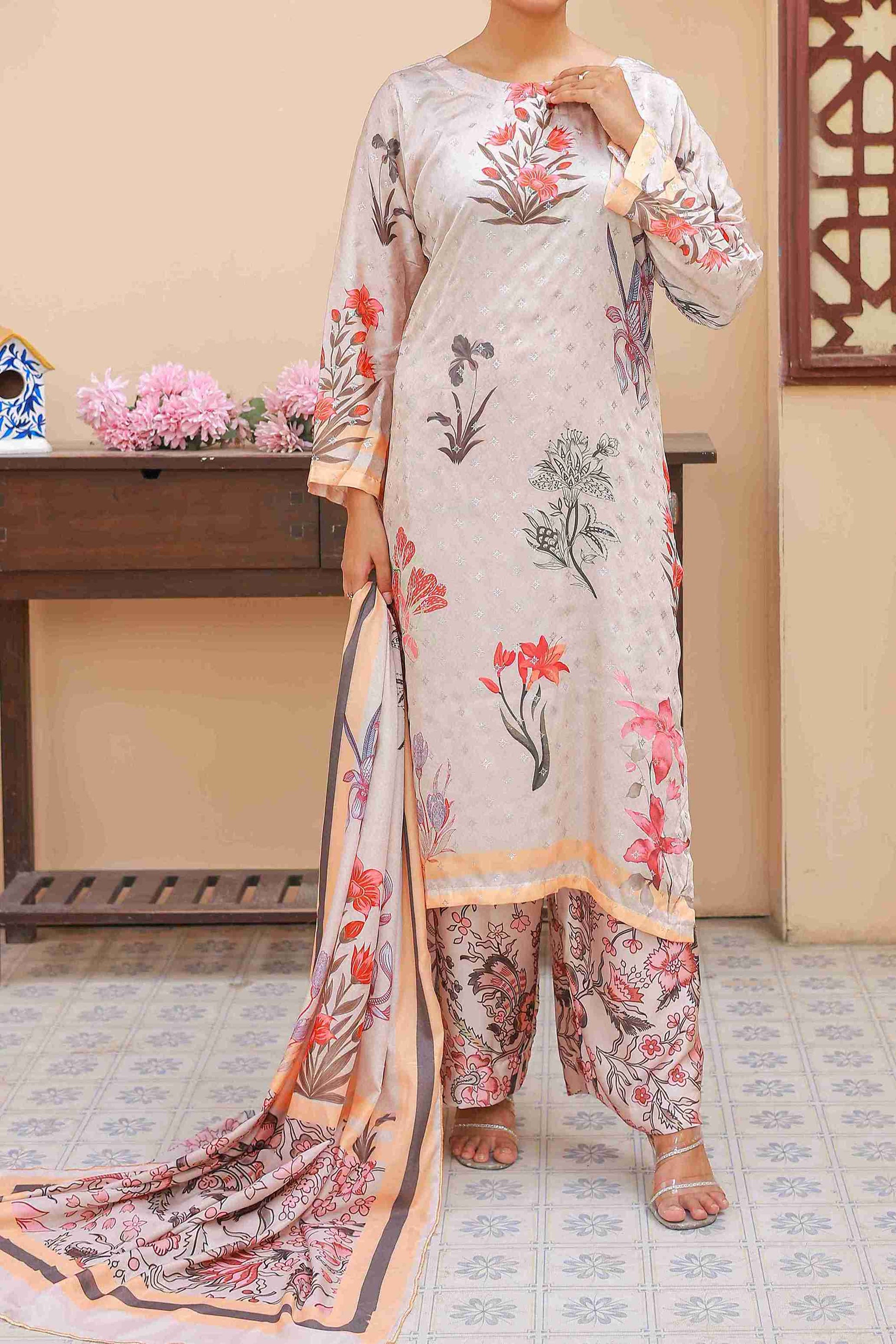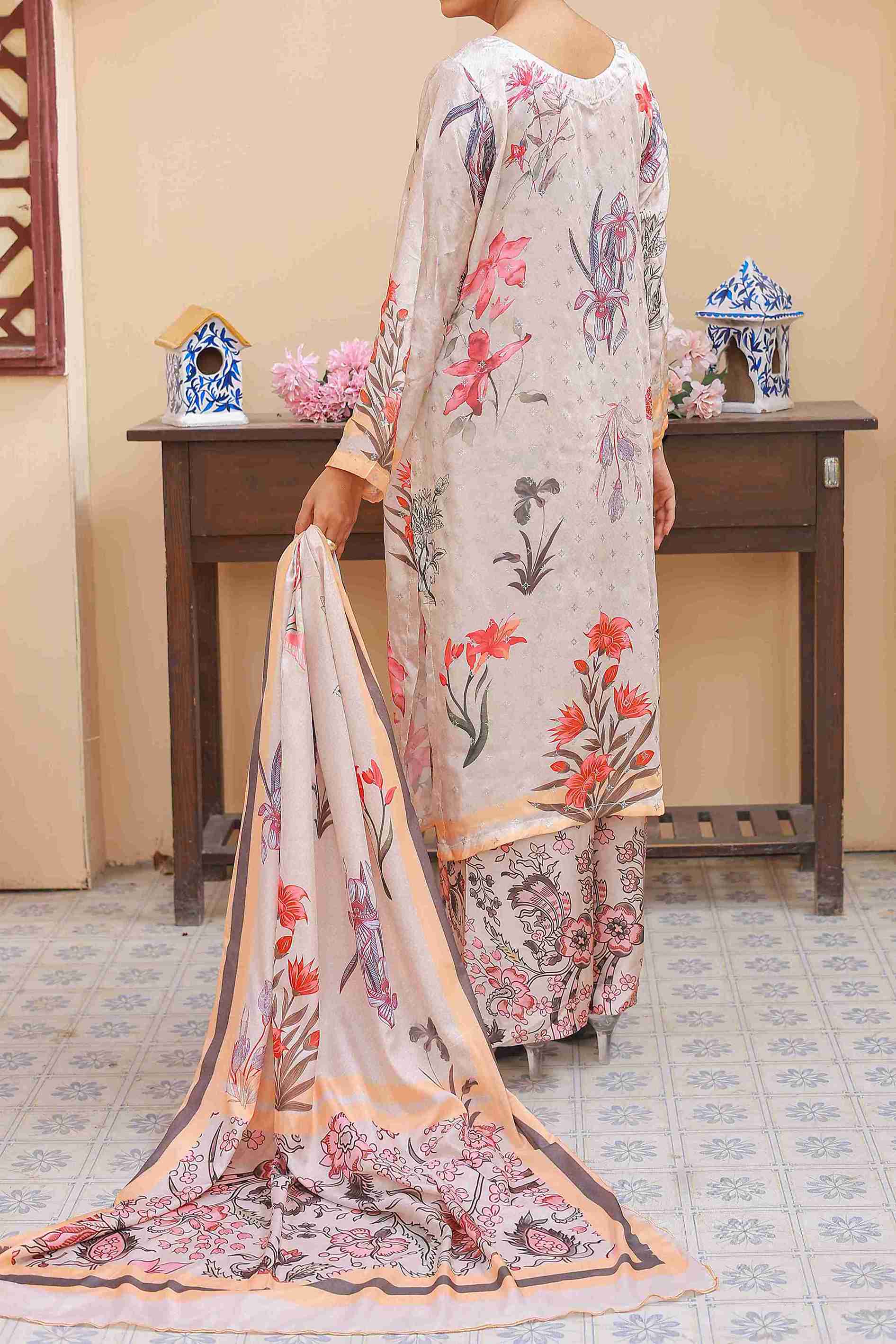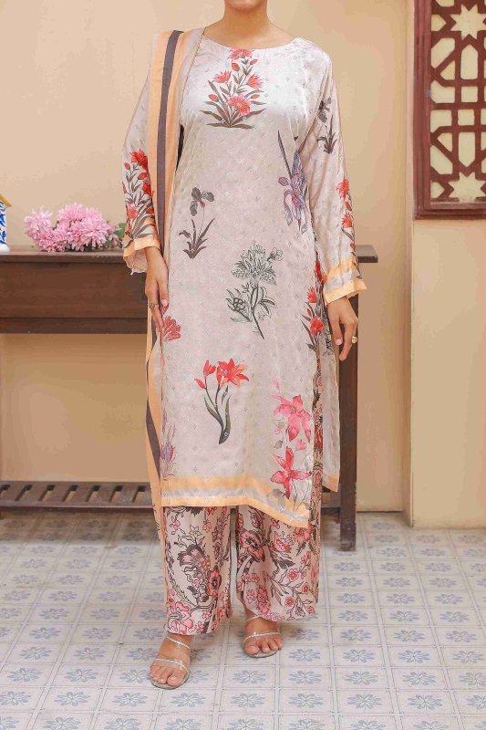 Radiate soft elegance with Peach Bloom, a charming 3‑piece ensemble in a subtle peach-beige base, adorned with vibrant floral prints in shades of coral, red, and lilac. The straight-cut shirt features delicate botanical artwork on the front and sleeves, framed with a peach-toned border for a refined touch. Paired with wide-leg trousers in matching peach-beige, enhanced by intricate floral and vine patterns, the look is completed with a lightweight dupatta adorned with coordinated floral designs and peach border accents.
