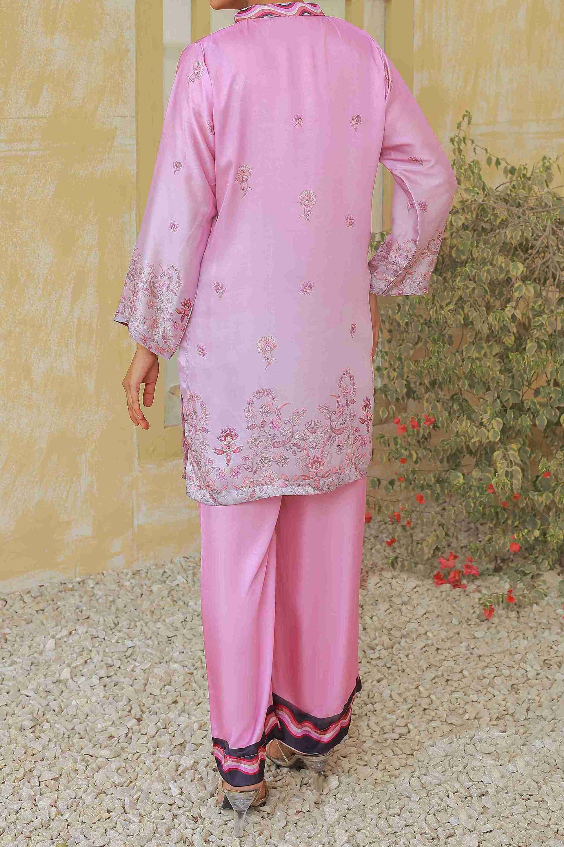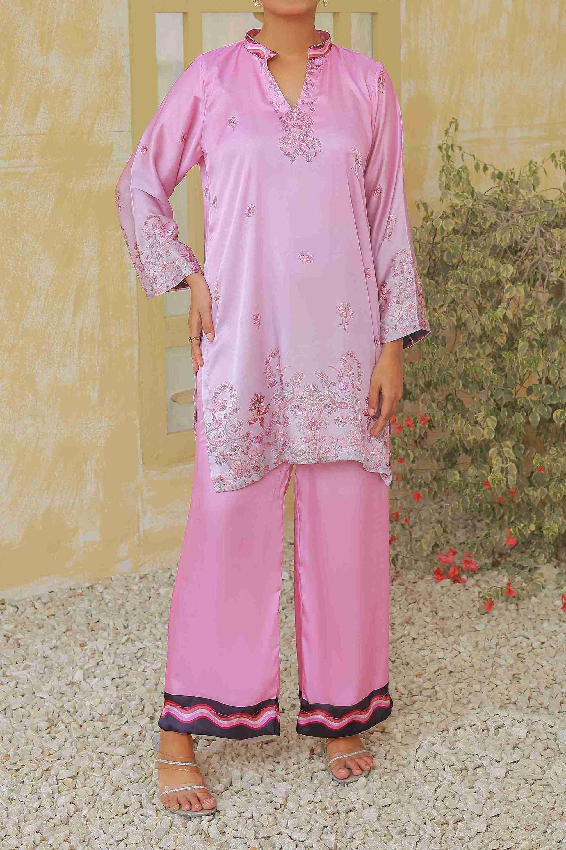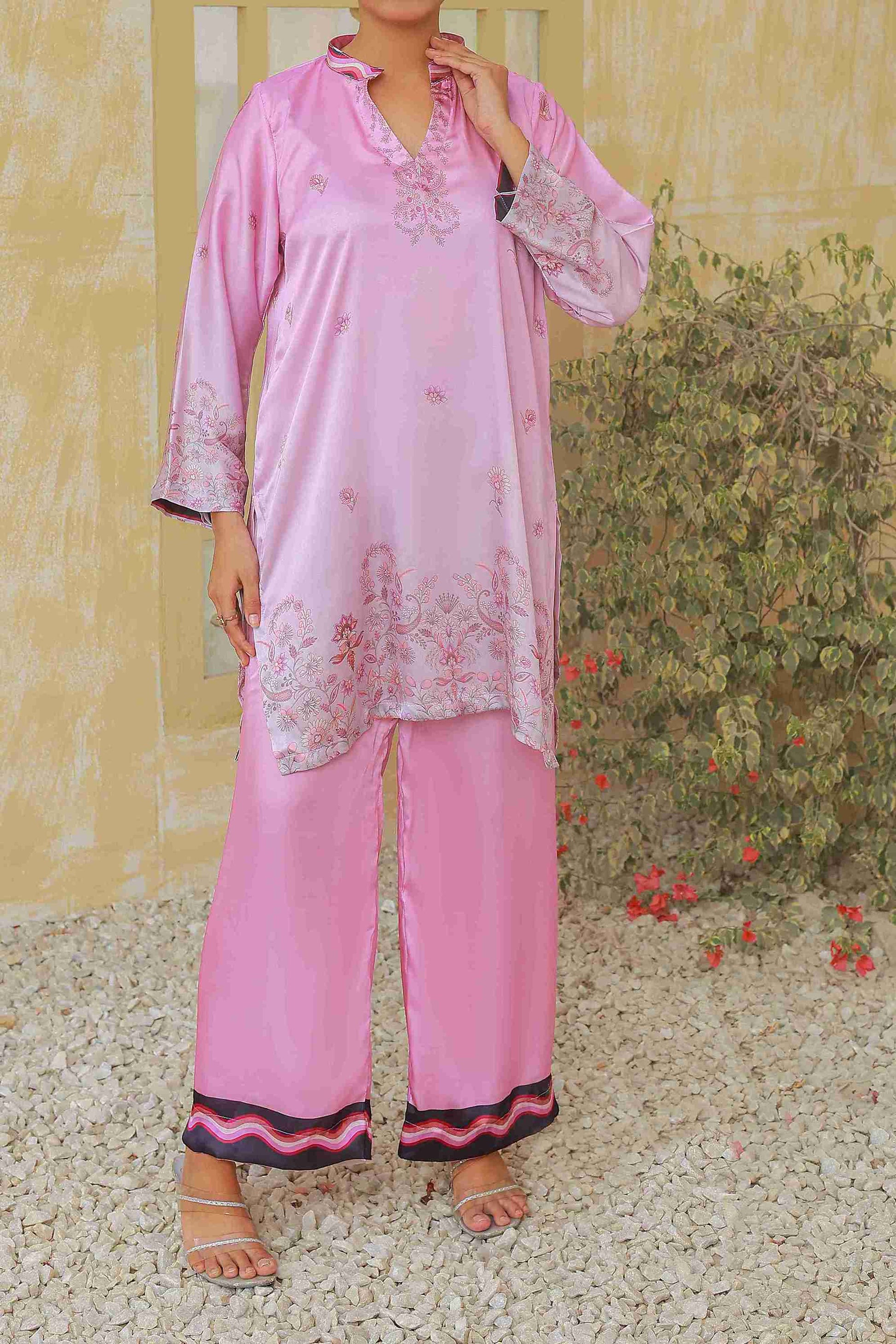 Radiate charm with Pink Allure, a stunning 2‑piece ensemble in a vibrant pink base, adorned with delicate floral embroidery in soft rose and silver tones. The shirt features a flattering V‑notch neckline with subtle collar detailing, complemented by intricate embroidered accents along the hem and sleeves. Paired with wide-leg trousers in matching pink, finished with a chic wavy border design in shades of black, maroon, and rose, this set exudes a perfect balance of elegance and modern flair.